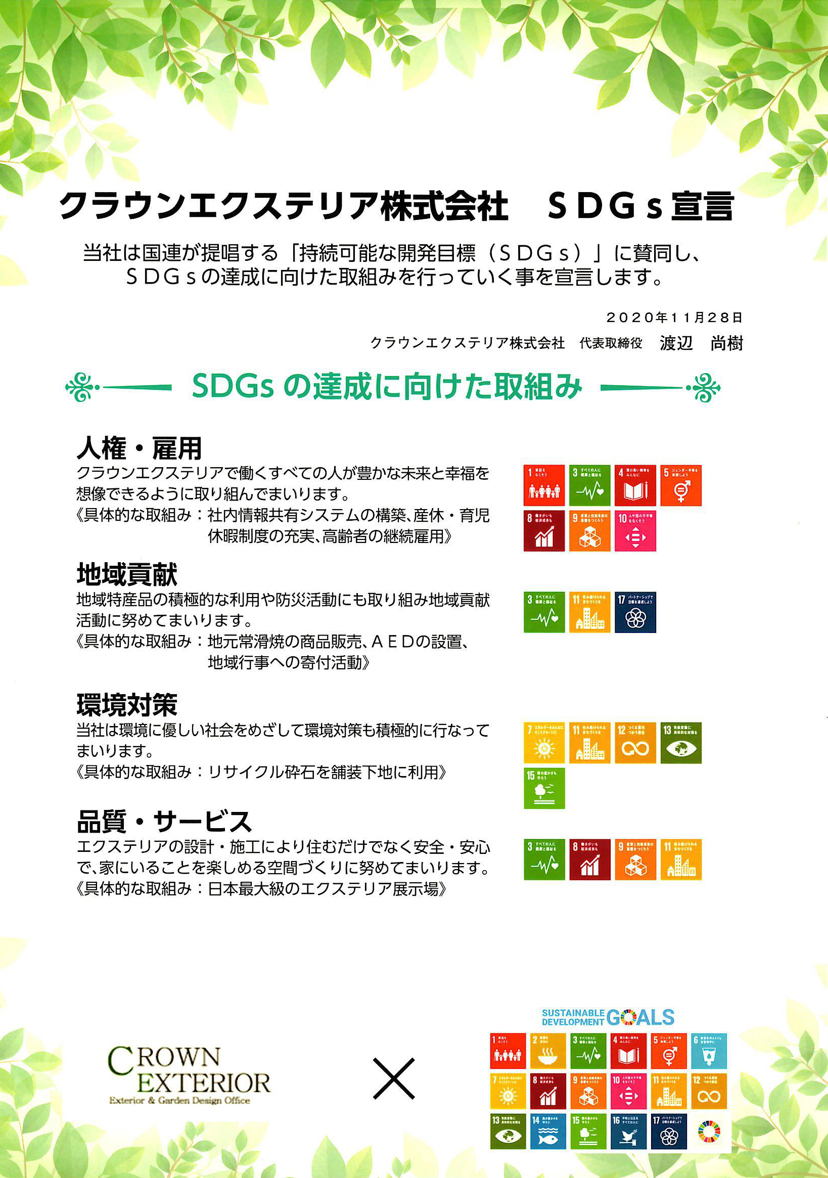 クラウンエクステリア株式会社は、持続可能な世界を実現するための17のゴール・169のターゲットから構成された開発目標の中から、私たちが行っている事業活動とリンクした課題を「クラウンエクステリアSDGs宣 言」として掲げます。