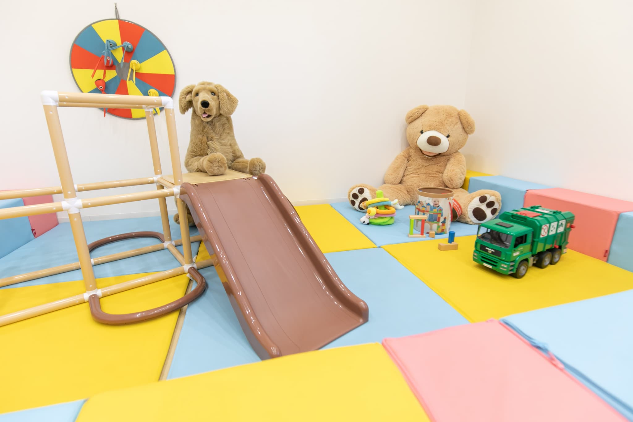 お子様連れでも気がねなくお越しいただけるようキッズコーナーを設置しております。また、男女各トイレ室内にはおむつ交換台も設置しています。