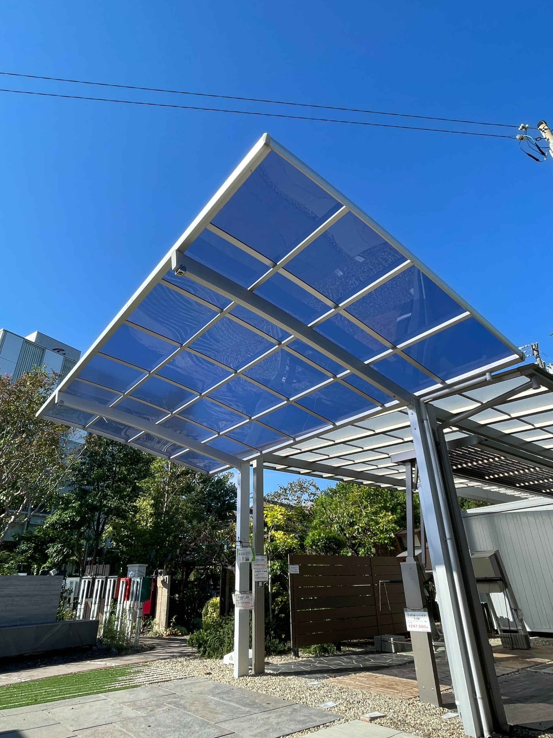強風に強く、変形地にも対応可能な折板カーポートや採光性の高いポリカ屋根のカーポートなど多彩な種類を展示しています。