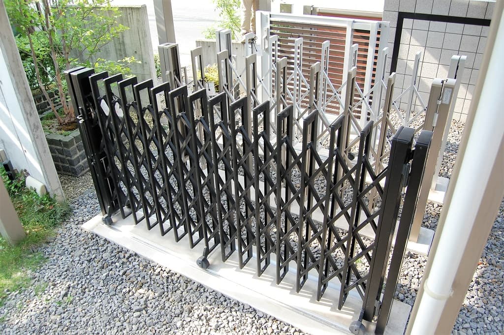 変形敷地や限られたスペースにも柔軟に対応できる伸縮門扉。車庫前や玄関前など、目的に合わせてお選びいただけます。