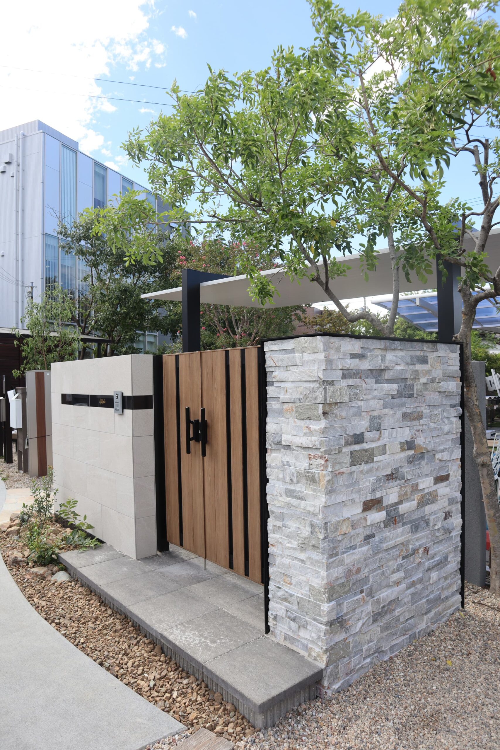 凹凸のある天然石とフラットな大判タイルを組み合わせたモダンな門柱デザインです。