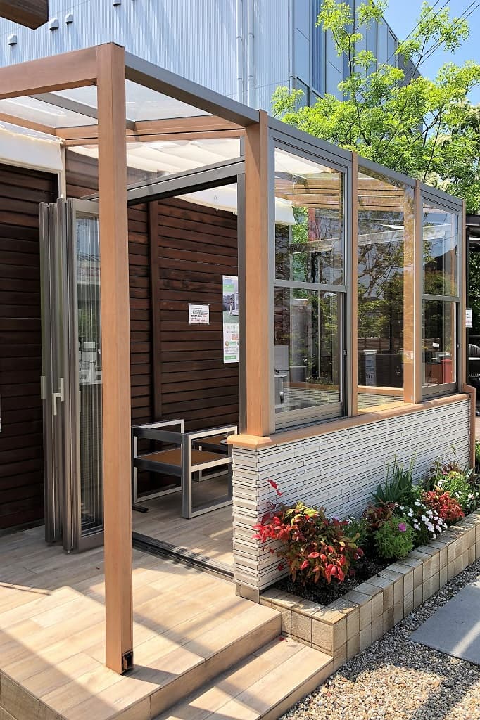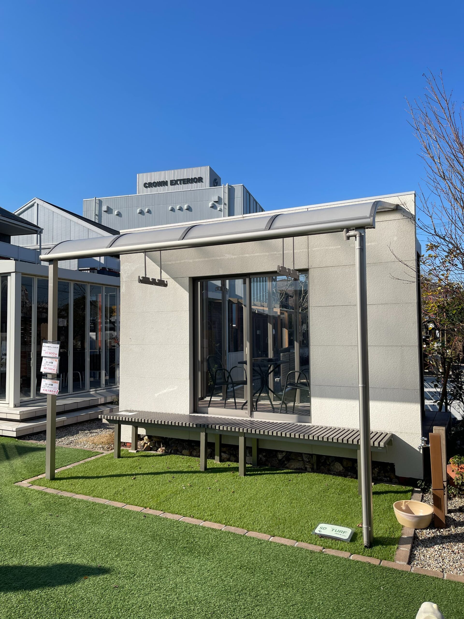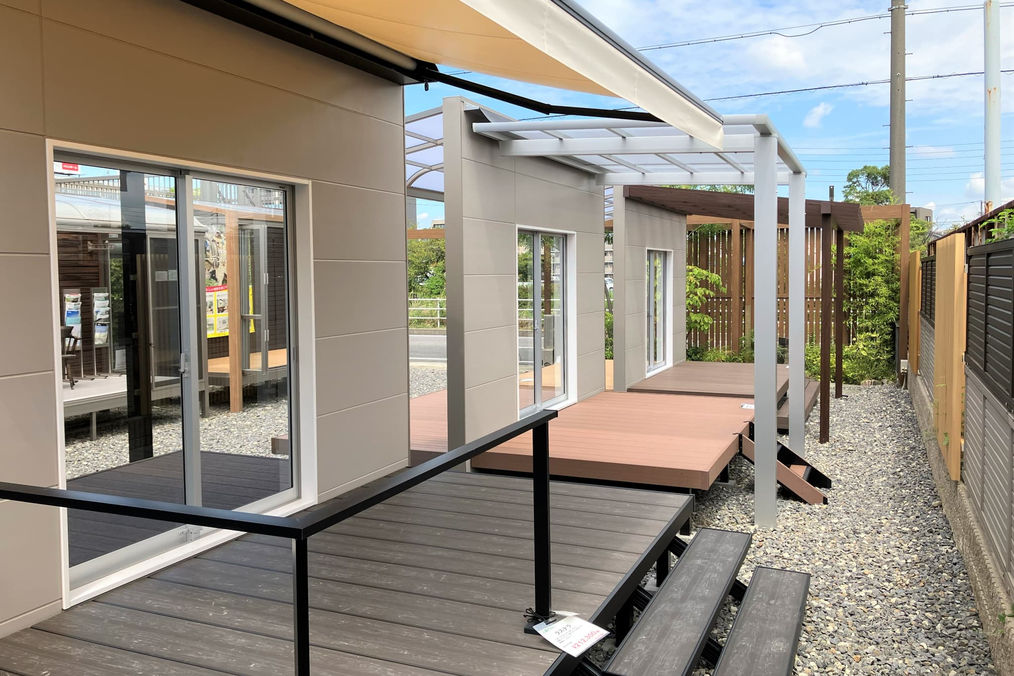 人気のある三協アルミ、タカショー、四国化成のウッドデッキとテラス、オーニングが展示してあります。