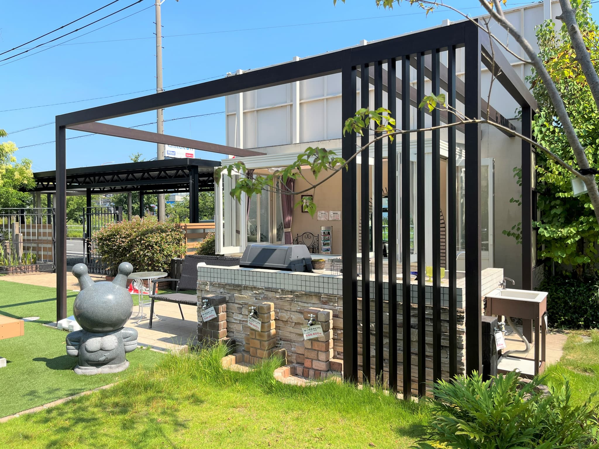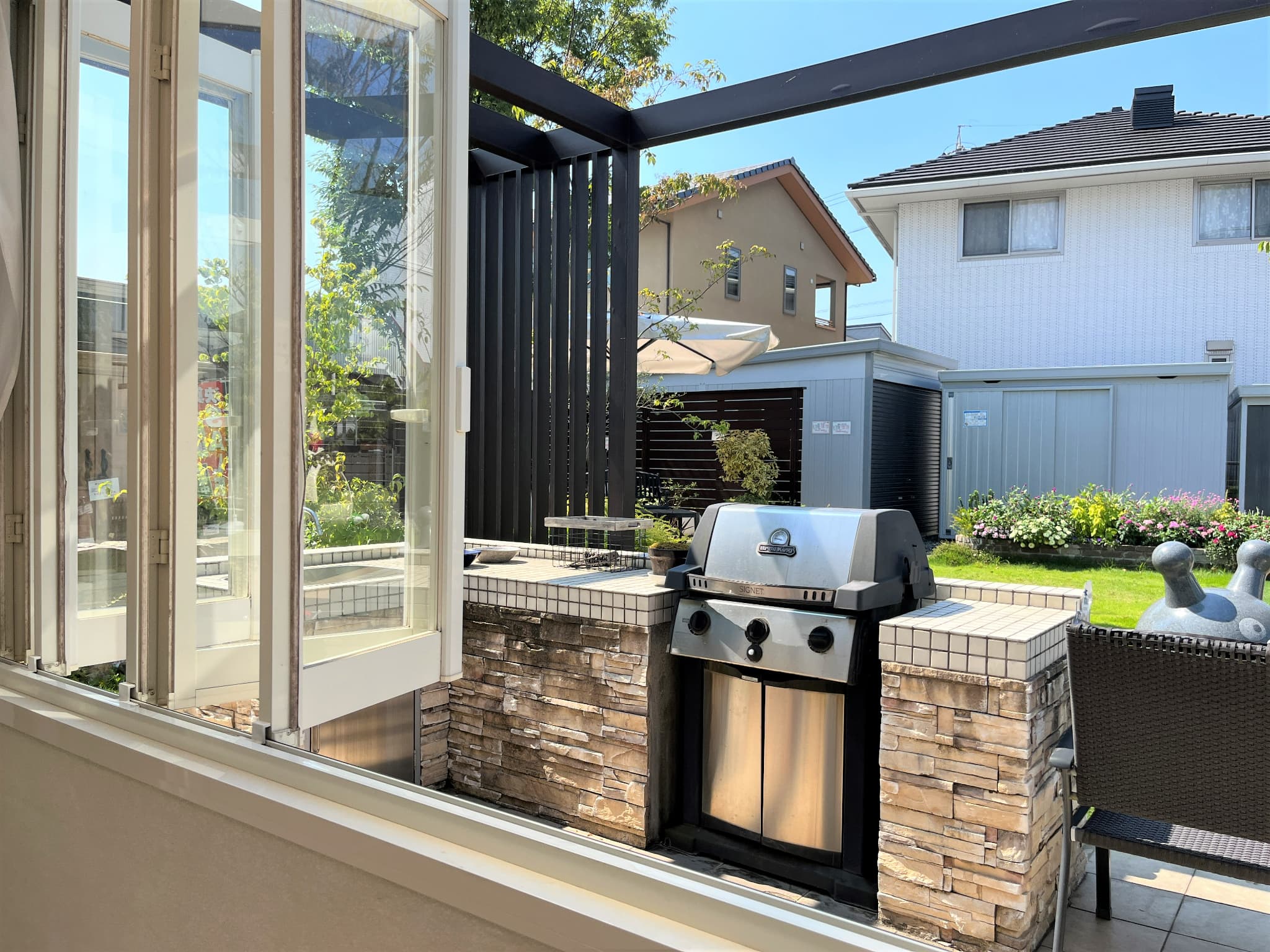 明るい日差しが降り注ぐ、キッチンを備えたアウトドアリビング。この空間で過ごせば、家族の絆も深まることでしょう。