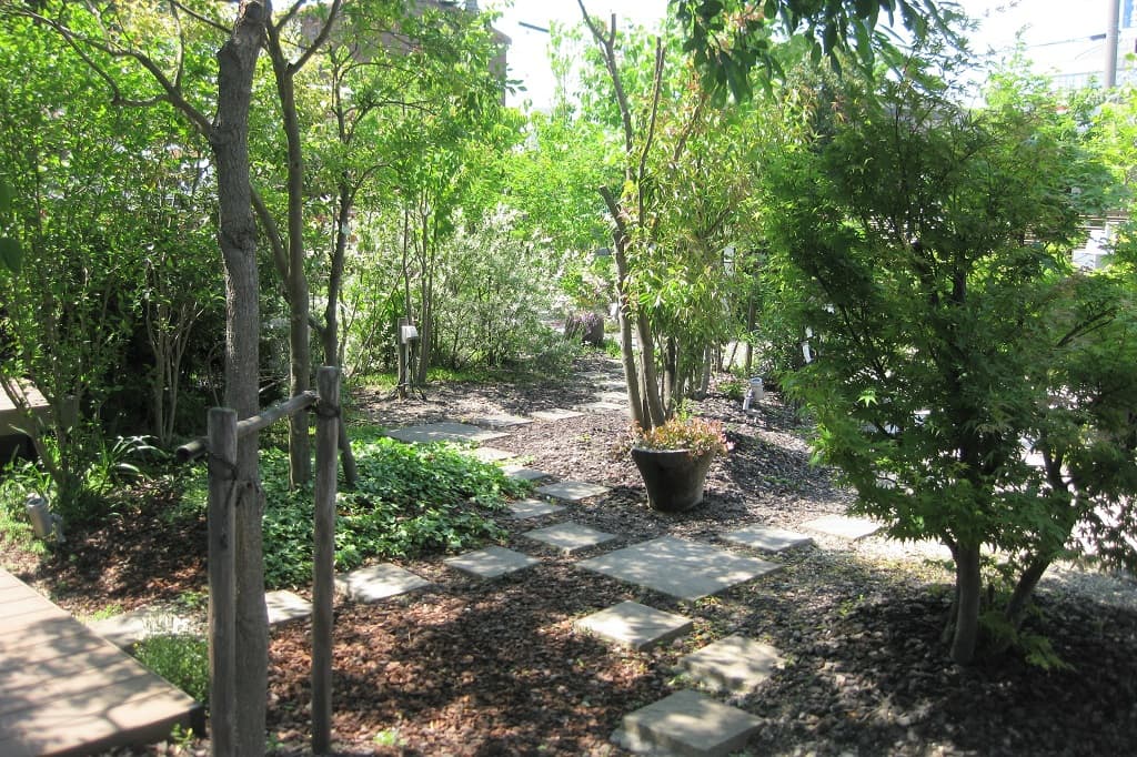 天然石の通路脇には自然がいっぱい。シンボルツリーや花壇の参考にもなる人気の通路です。