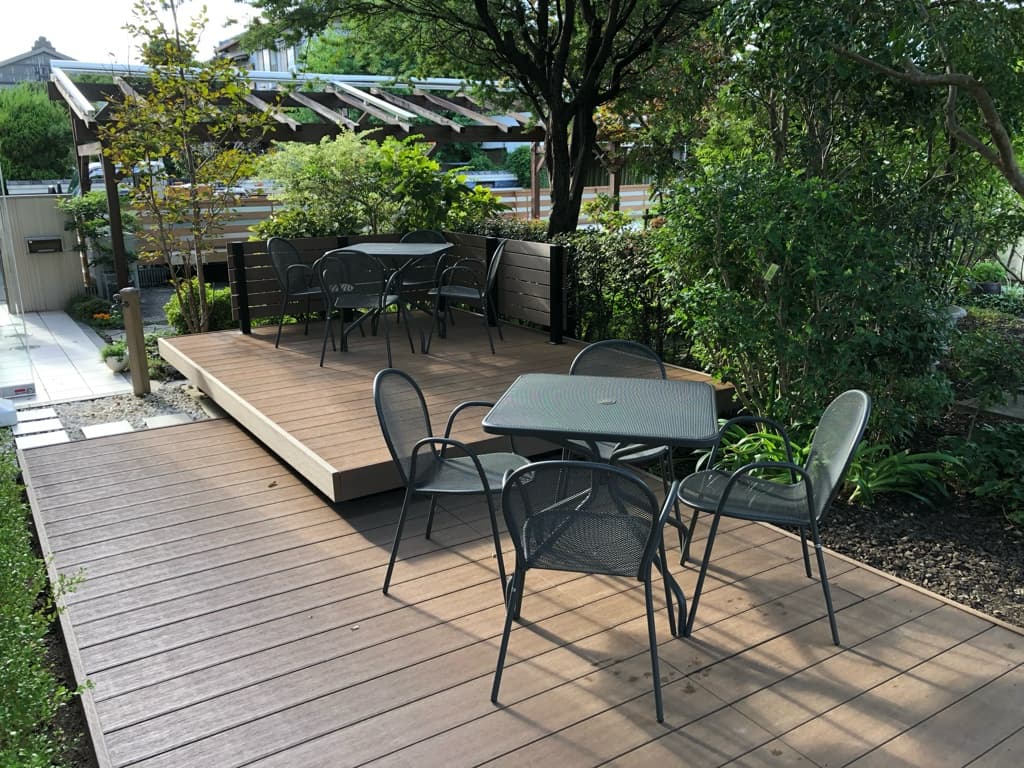 サロンから一望できる空間には、広々としたLIXILのウッドデッキDSが見えます。色や形、大きさなど自由にデザインすることができます。
