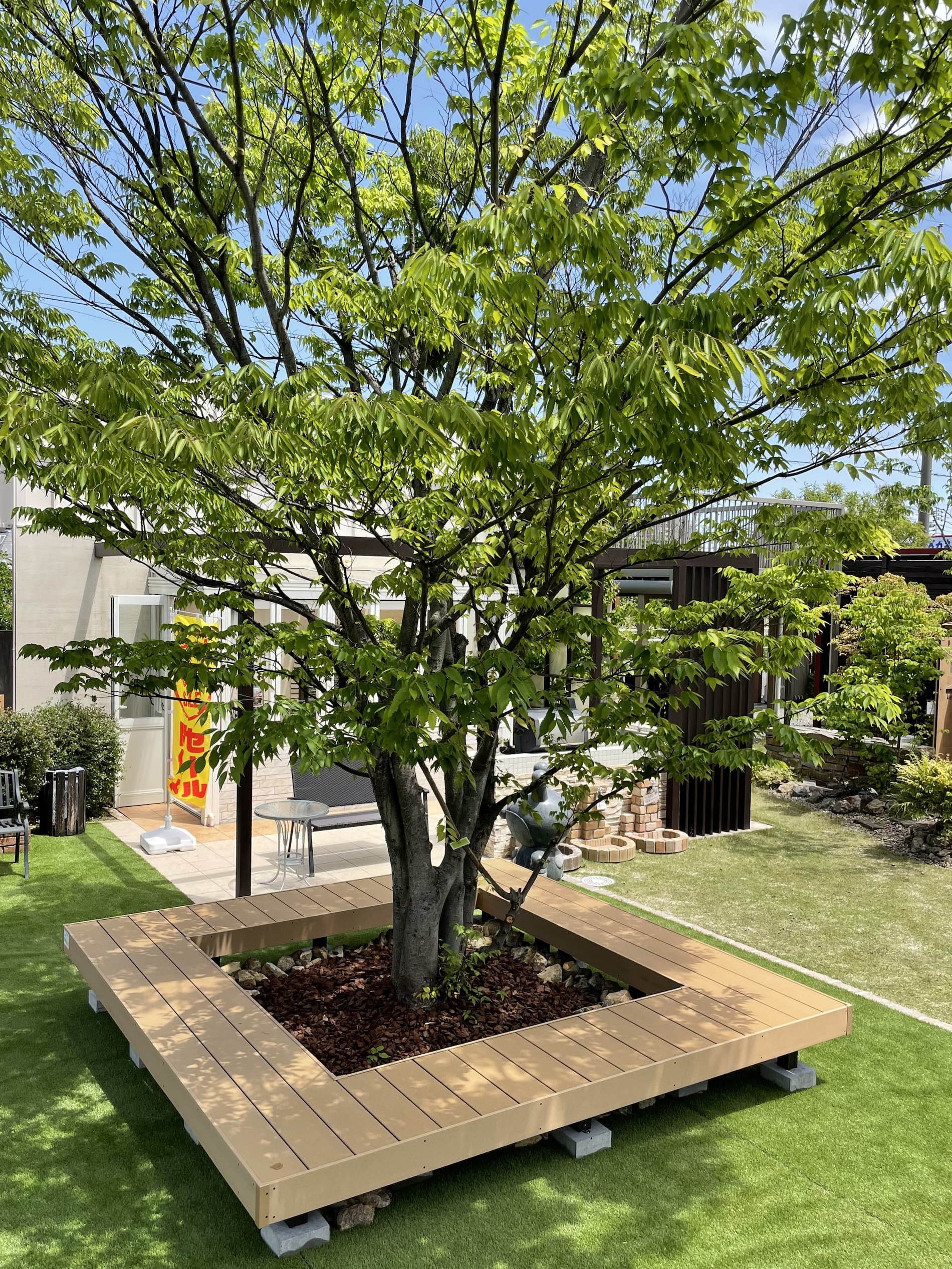 人気の杉板調や石模様の大判タイルを使用し、ベンチにもなる立体感のあるデザインです。