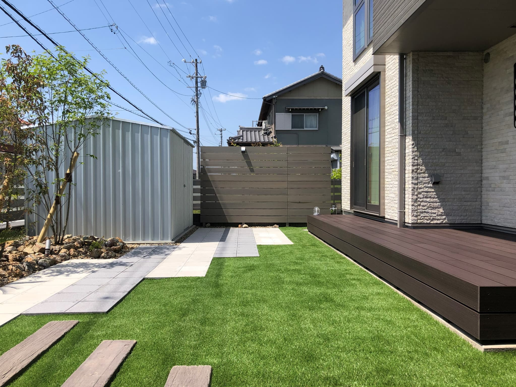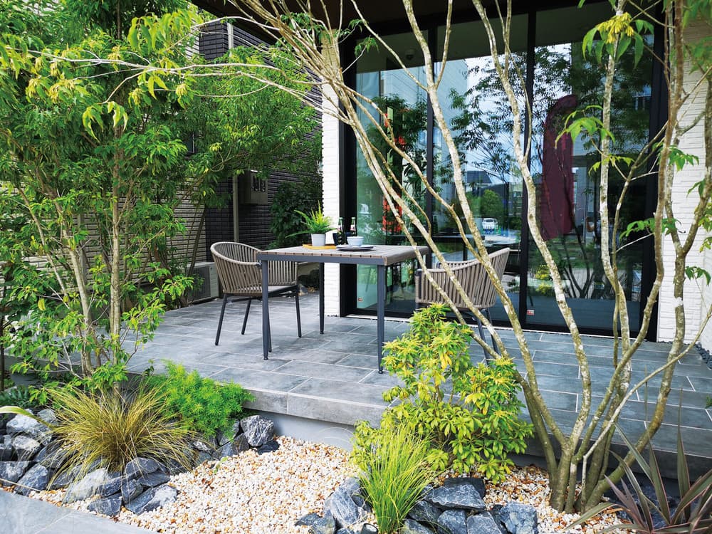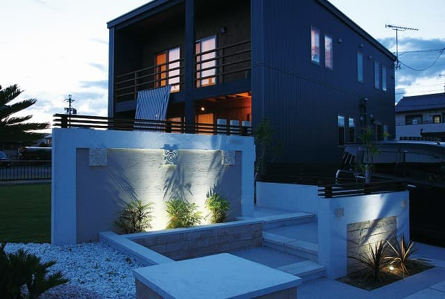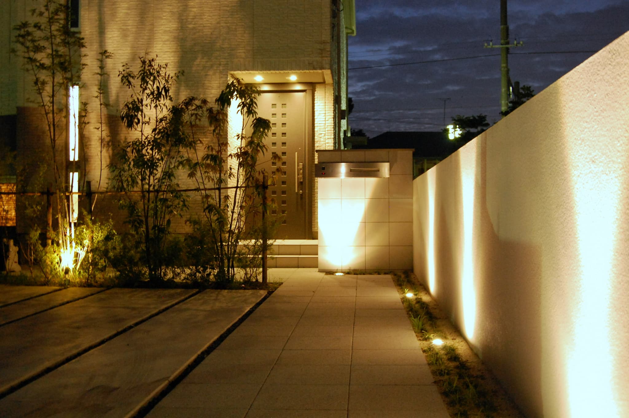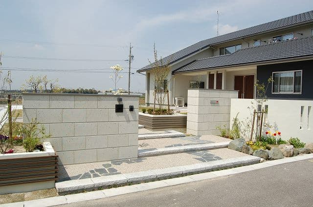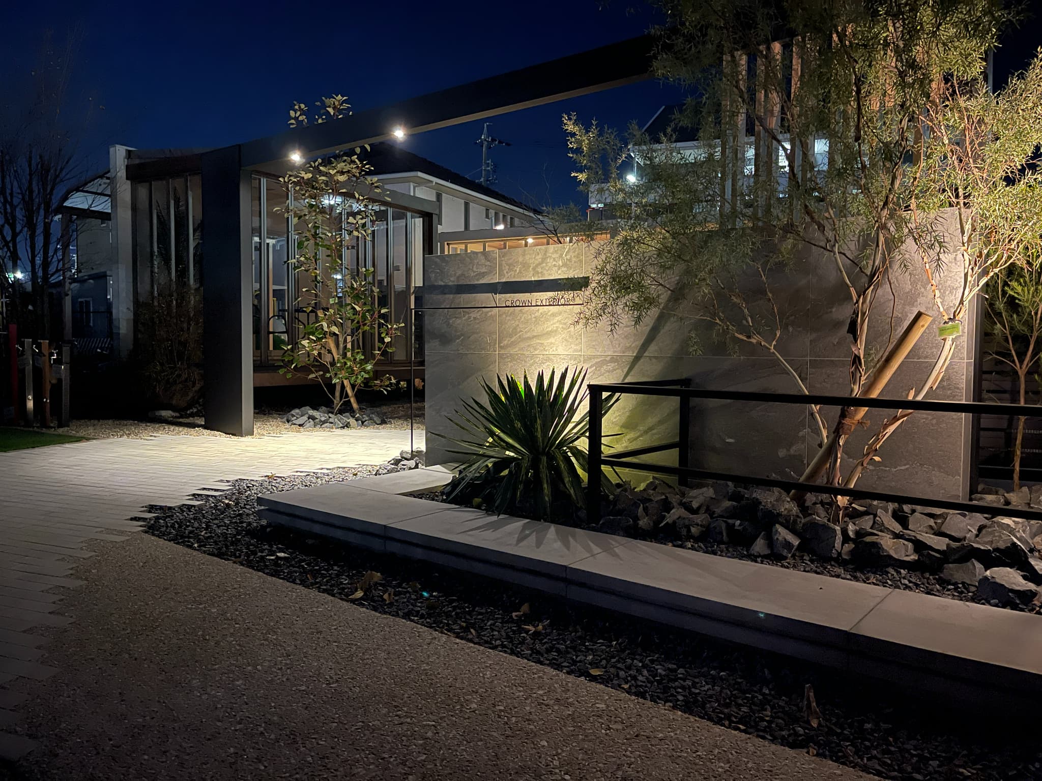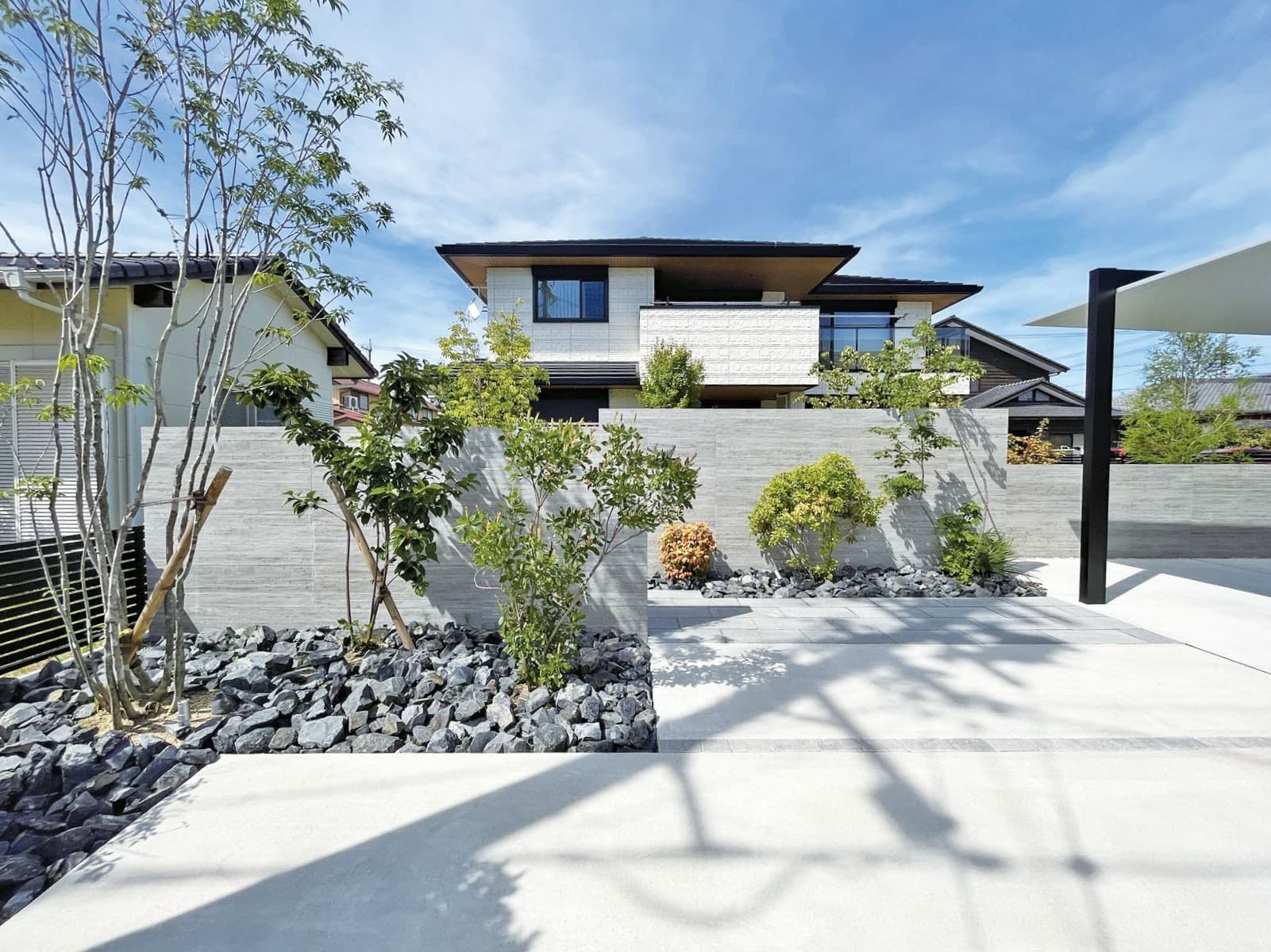スタイリッシュな門柱にグリーンが映えるエントランス
