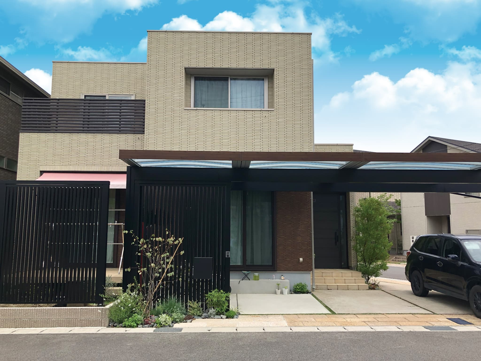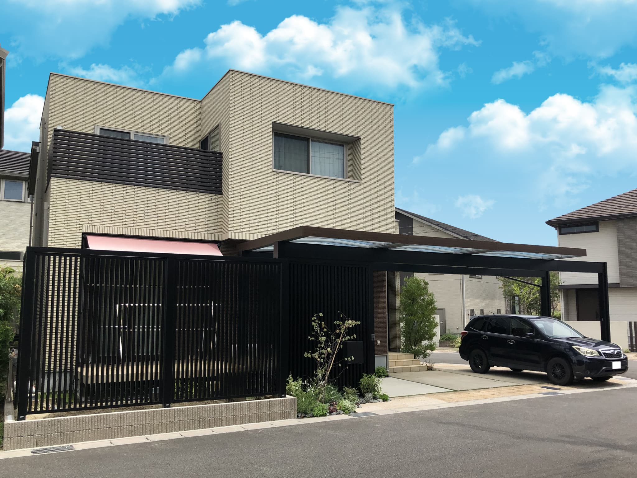 カースペースをメインにお庭とファサード部分を大きくリフォームしました。変形地対応の大型カーポートにより敷地に合わせたフレキシブルな提案が可能になり、快適なエントランス空間になりました。