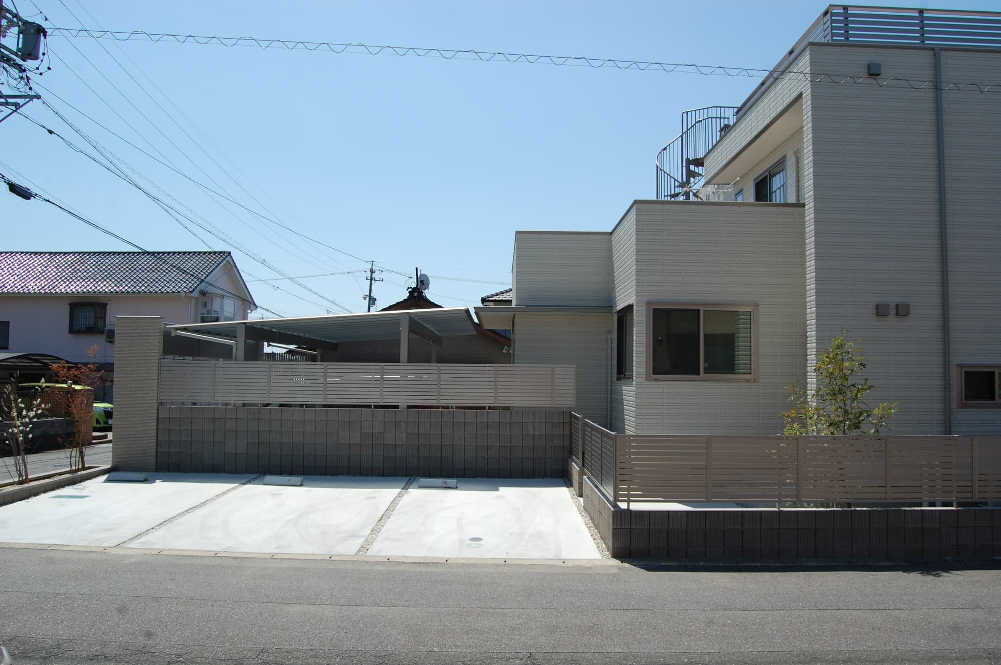凹凸のあるタイルを貼った重厚感と風格漂うファサード。シャッターゲートで防犯性の高いエクステリアを実現しました。
