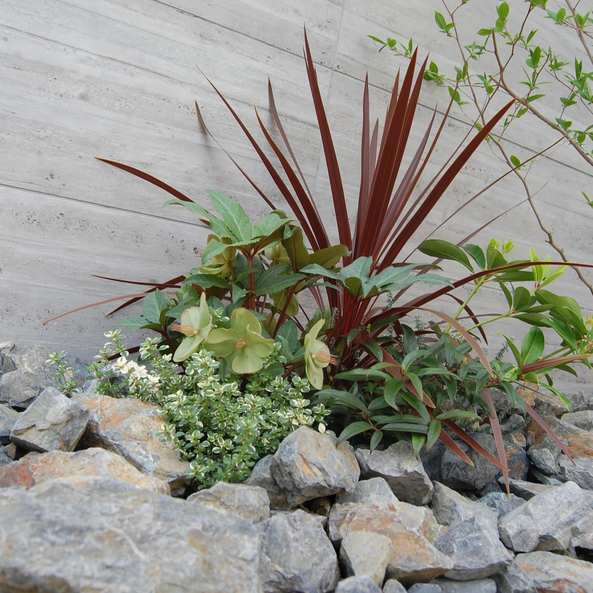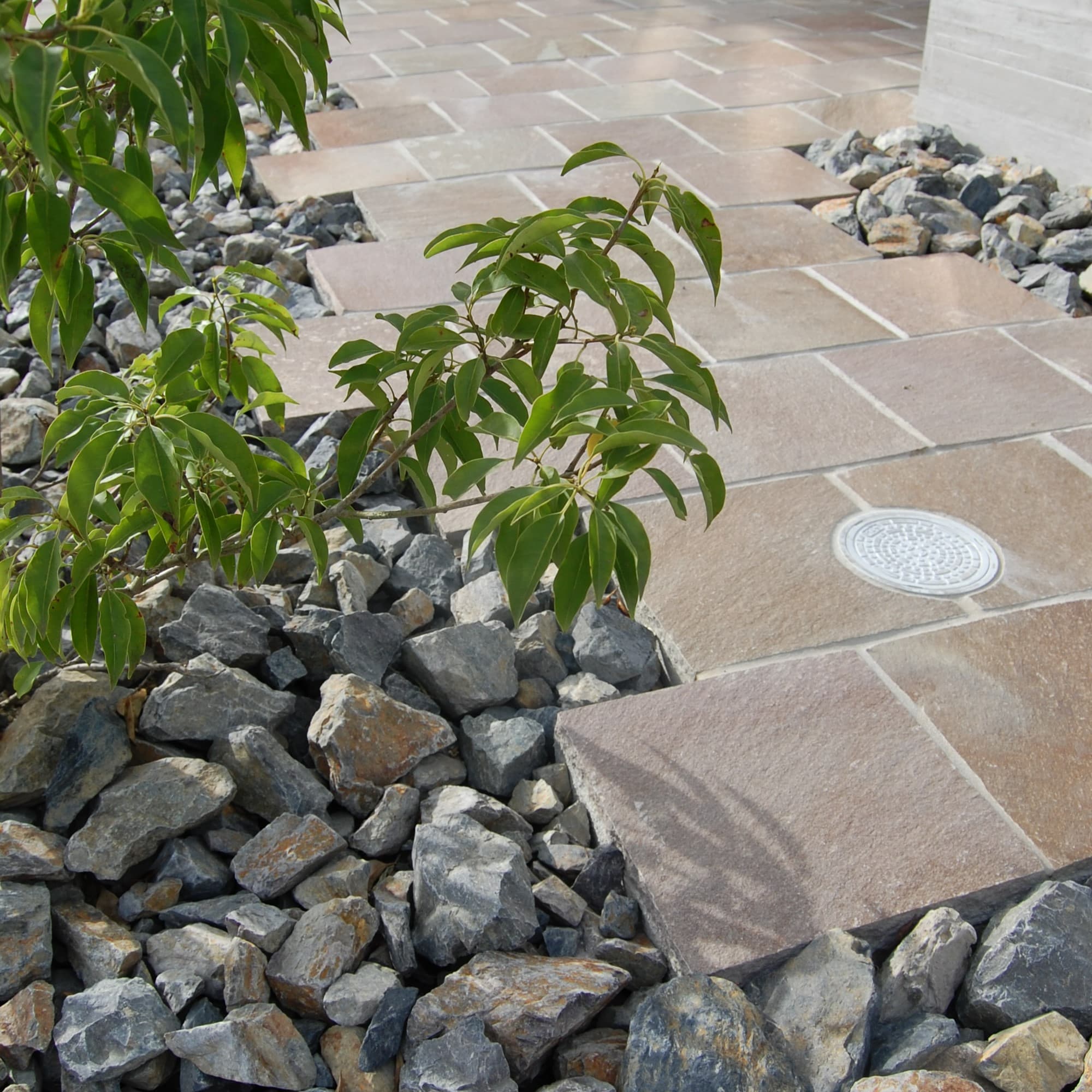 セラウォールRC杉板調の門柱に、天然石のアプローチの組み合わせ。異素材も植栽を絡めることでナチュラルに馴染みます。