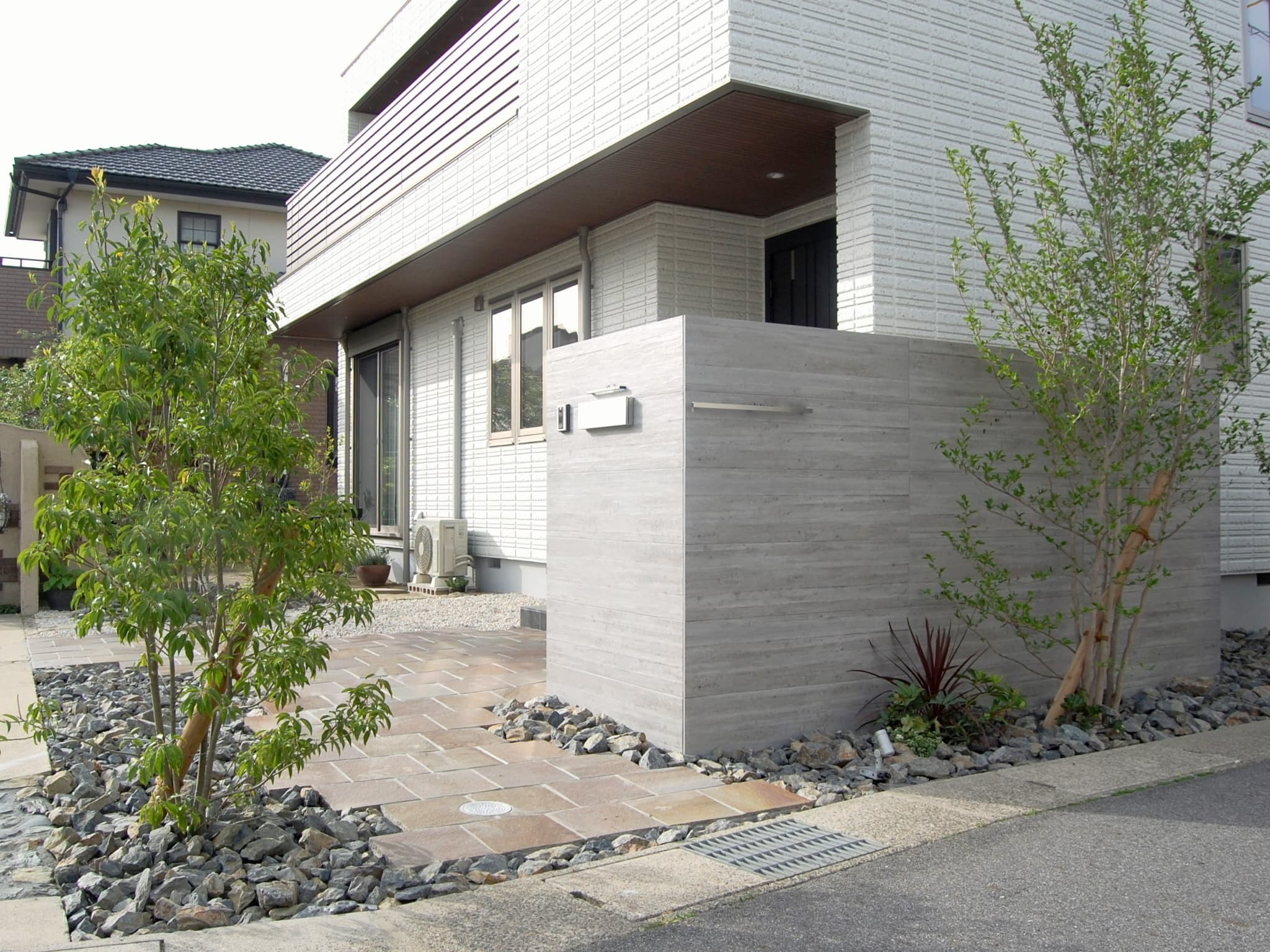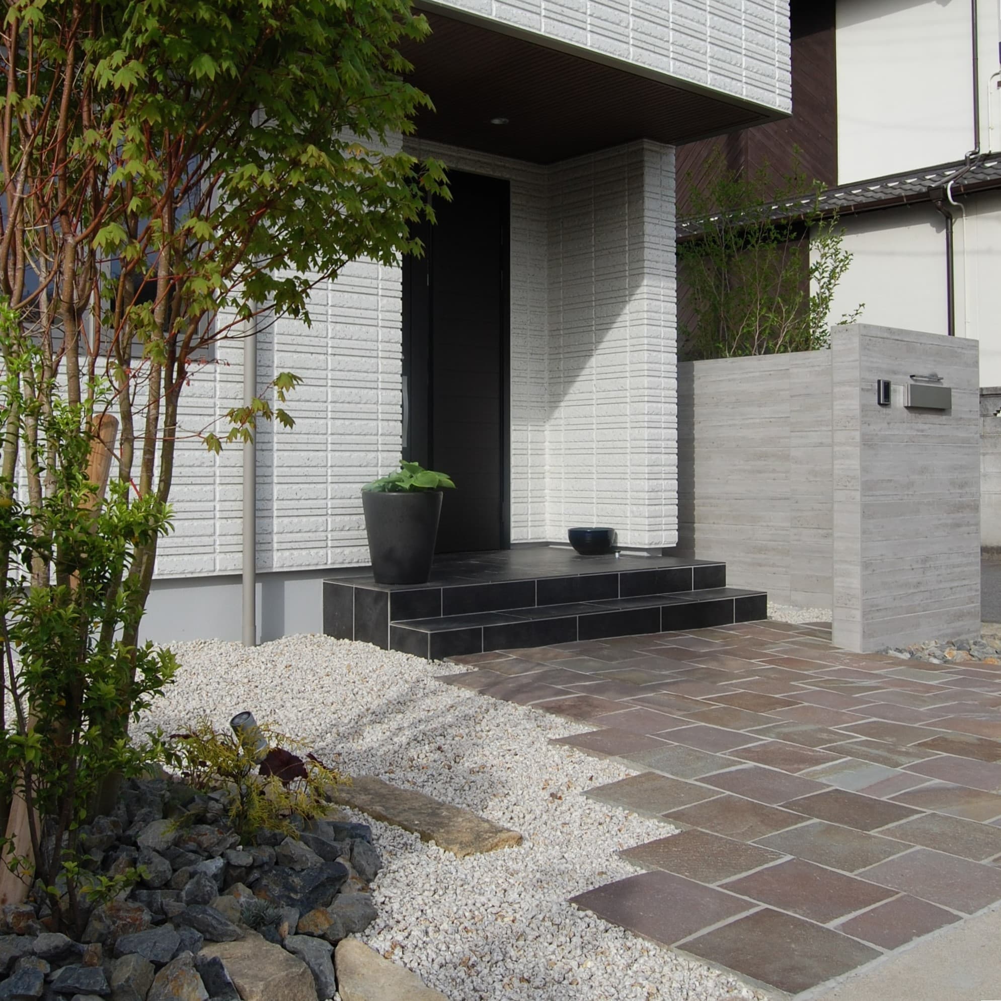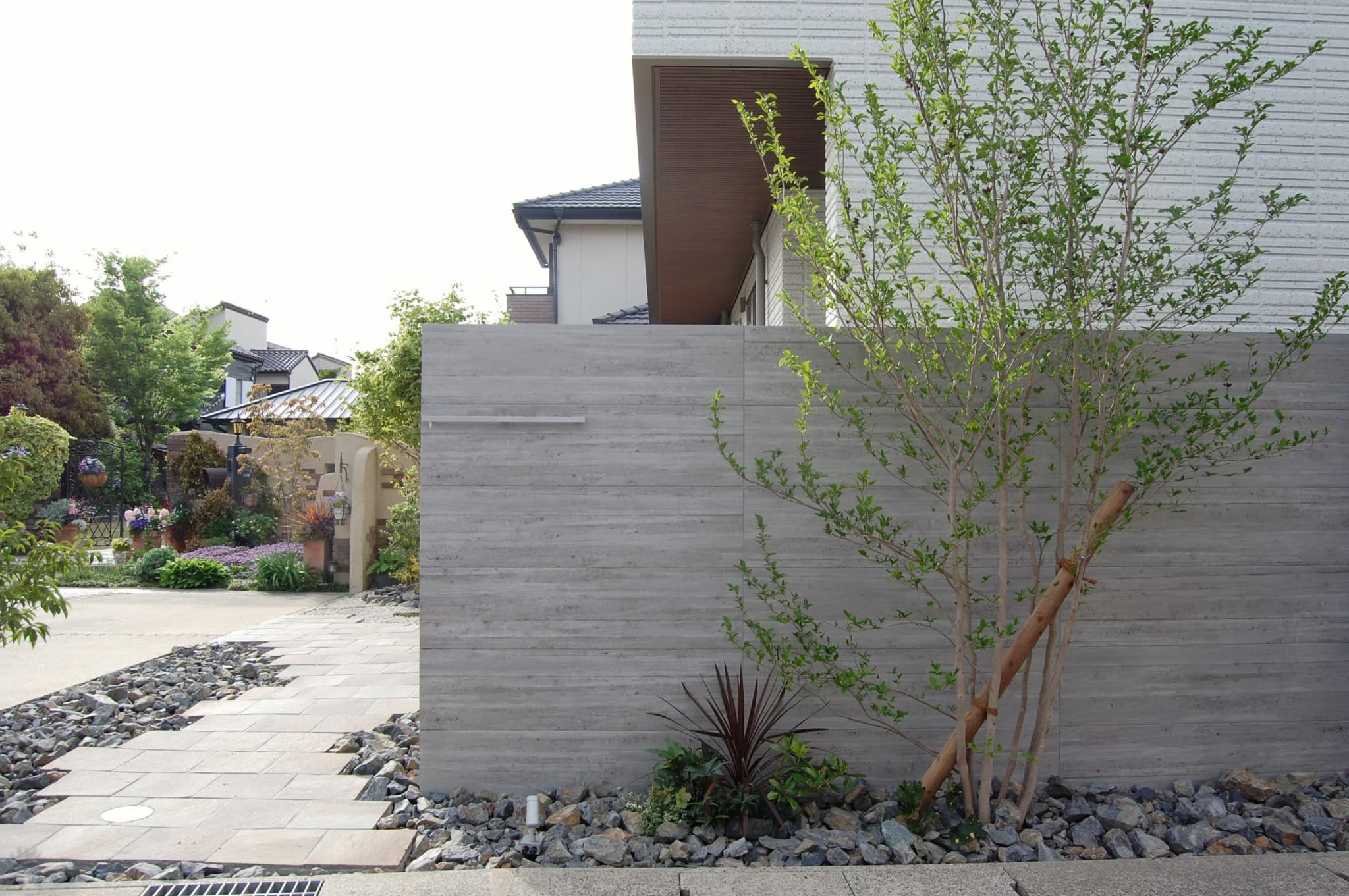 セラウォールRC杉板調の門柱に、天然石のアプローチの組み合わせ。異素材も植栽を絡めることでナチュラルに馴染みます。