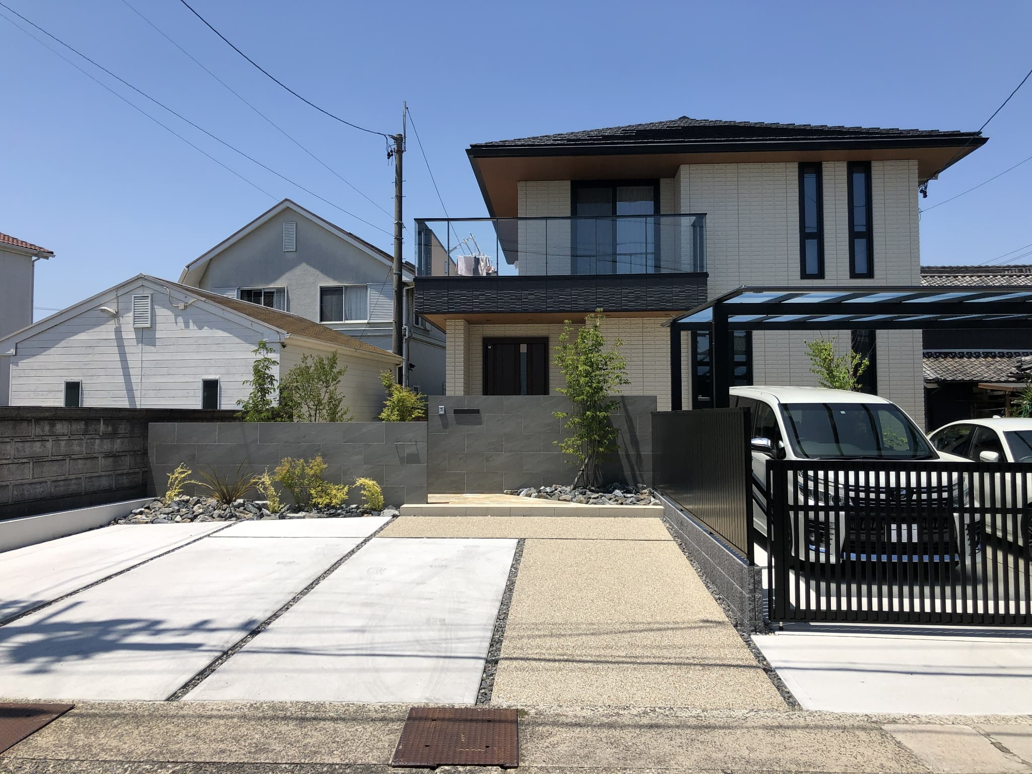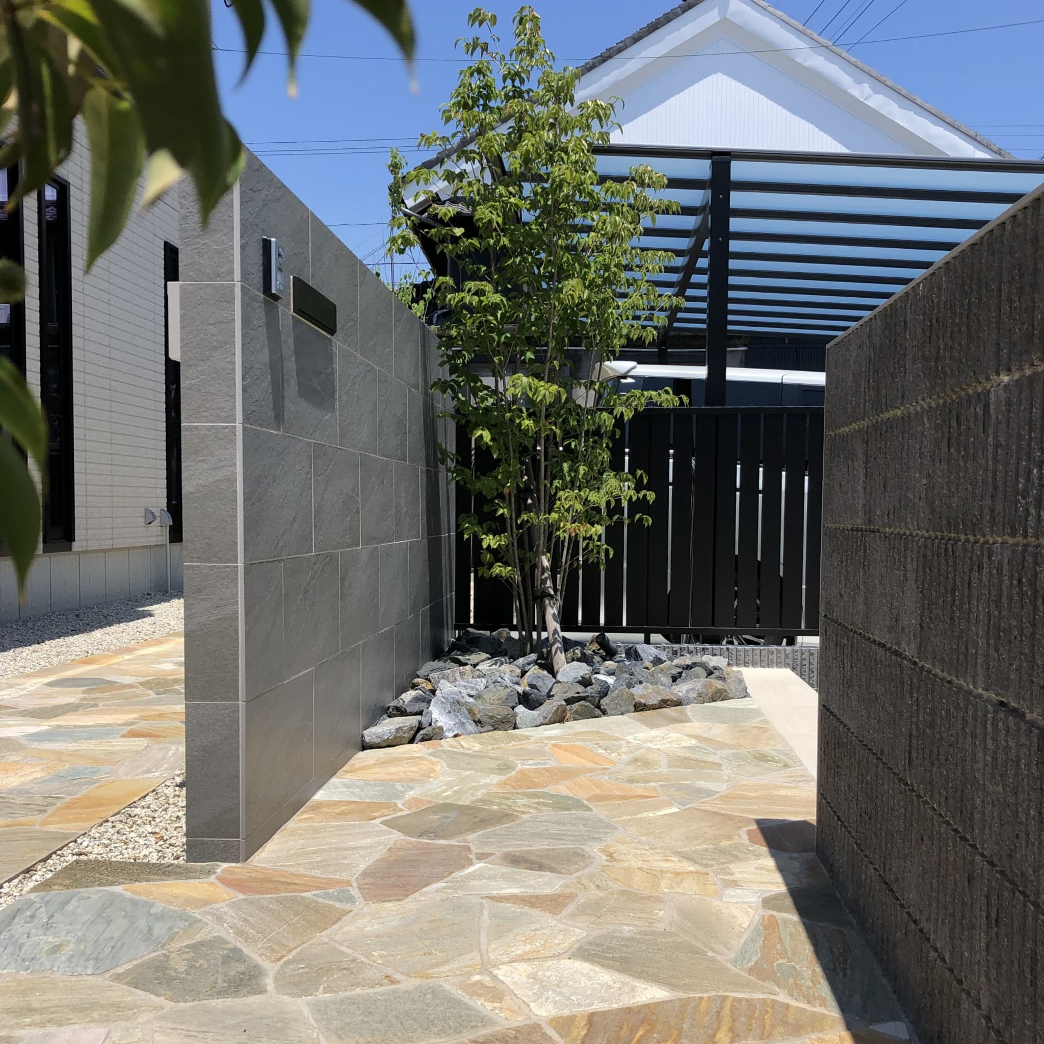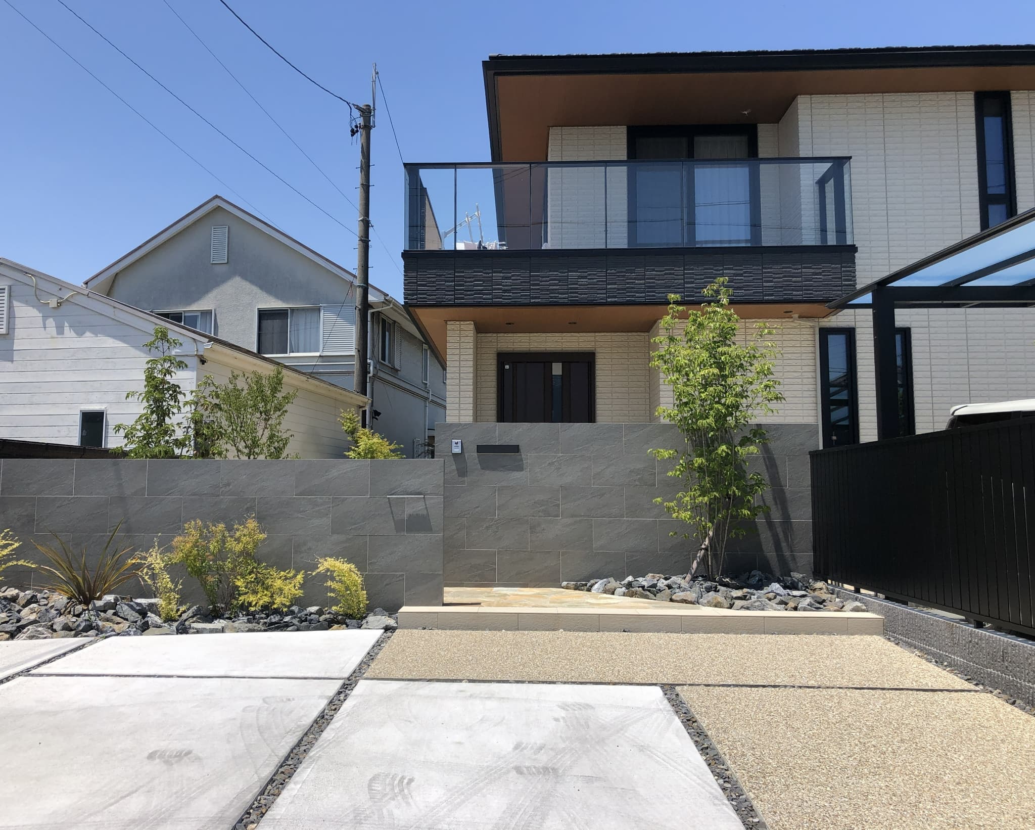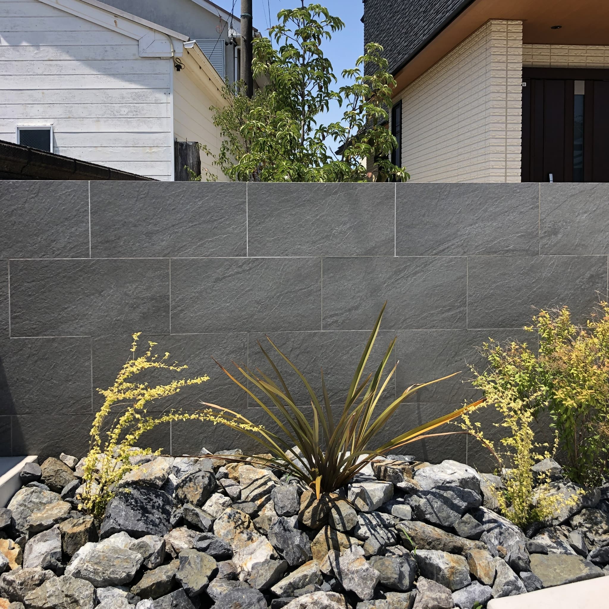 広い間口に見合う大きな意匠壁を設け、迫力ある空間を演出。グレー調の石柄タイルと割栗石の素材感が植栽の緑と馴染む表情豊かなファサード空間です
