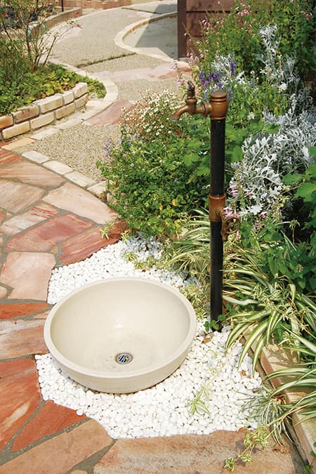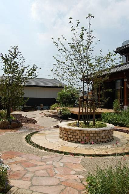 天然素材を贅沢に使用したナチュラルなお庭。シンボルツリーの周りにはレンガ造りのベンチを設置し、ゆったりと季節を感じることができます。