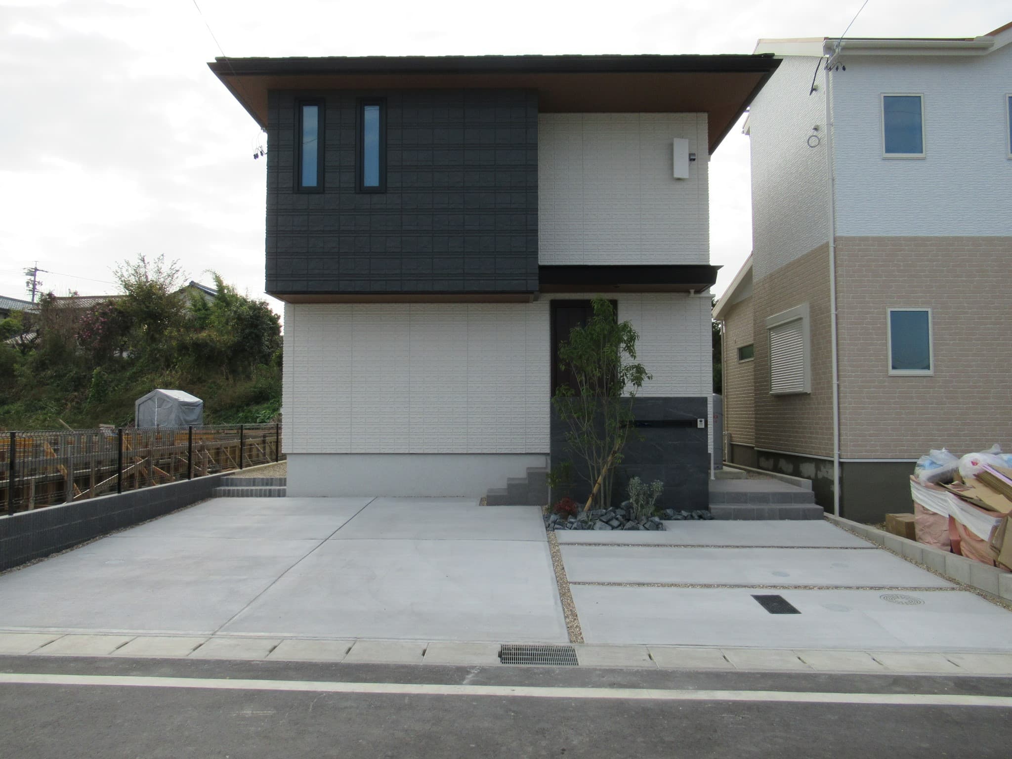 外壁のアクセントに合わせたブラックタイル門柱と玄関目隠しを兼ねたシンボルツリーを重ね、立体感のあるエントランスになりました。