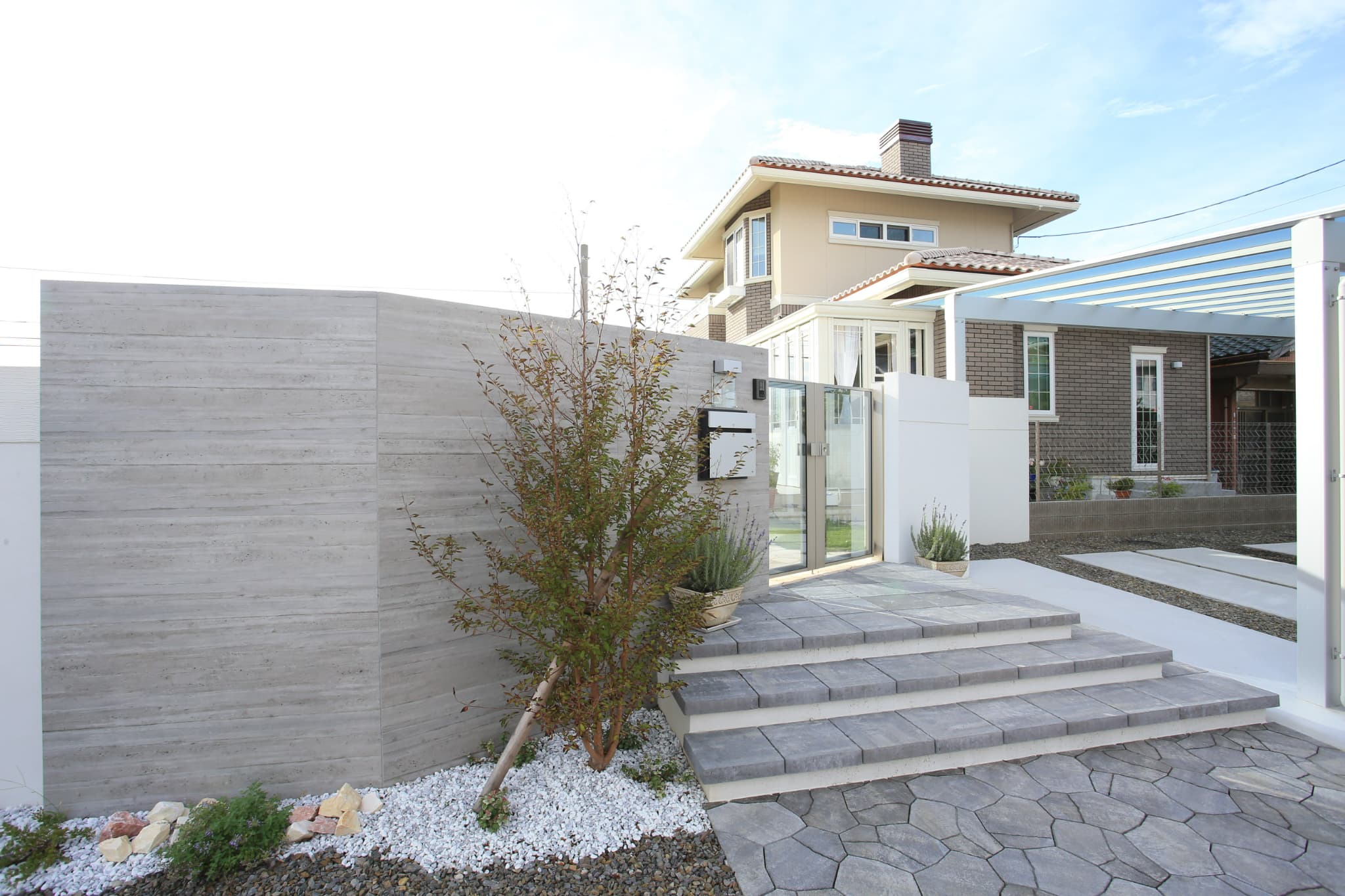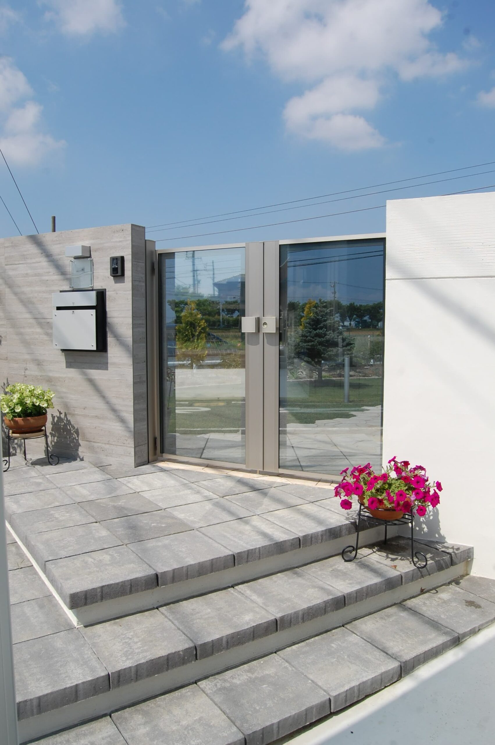 前面道路に対して斜めに設計されたエントランス。ミラーガラスのモダンなデザイン門扉が印象的です。