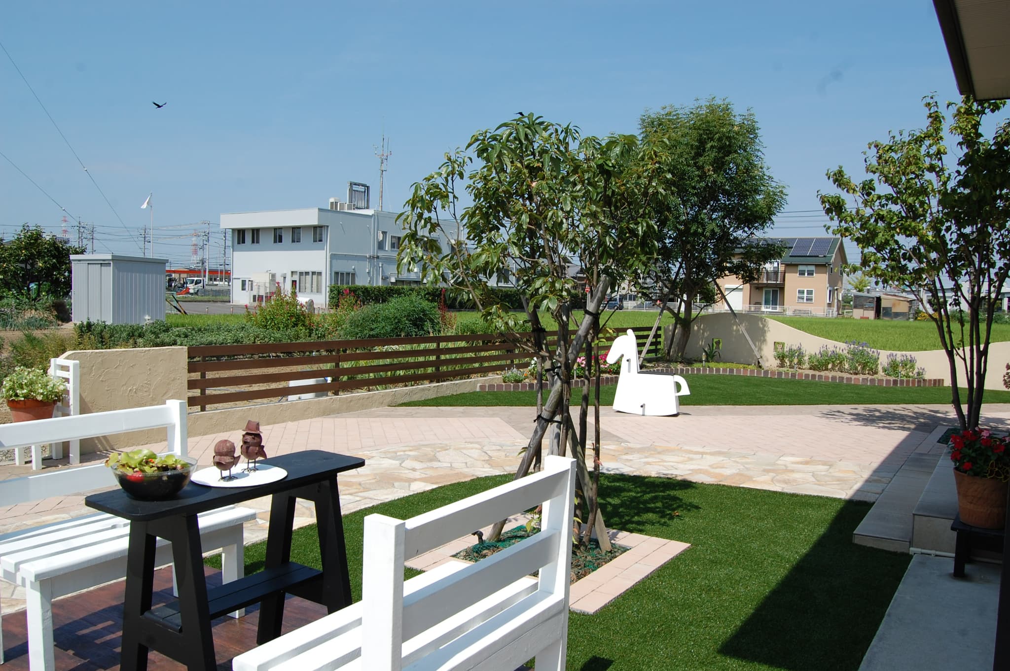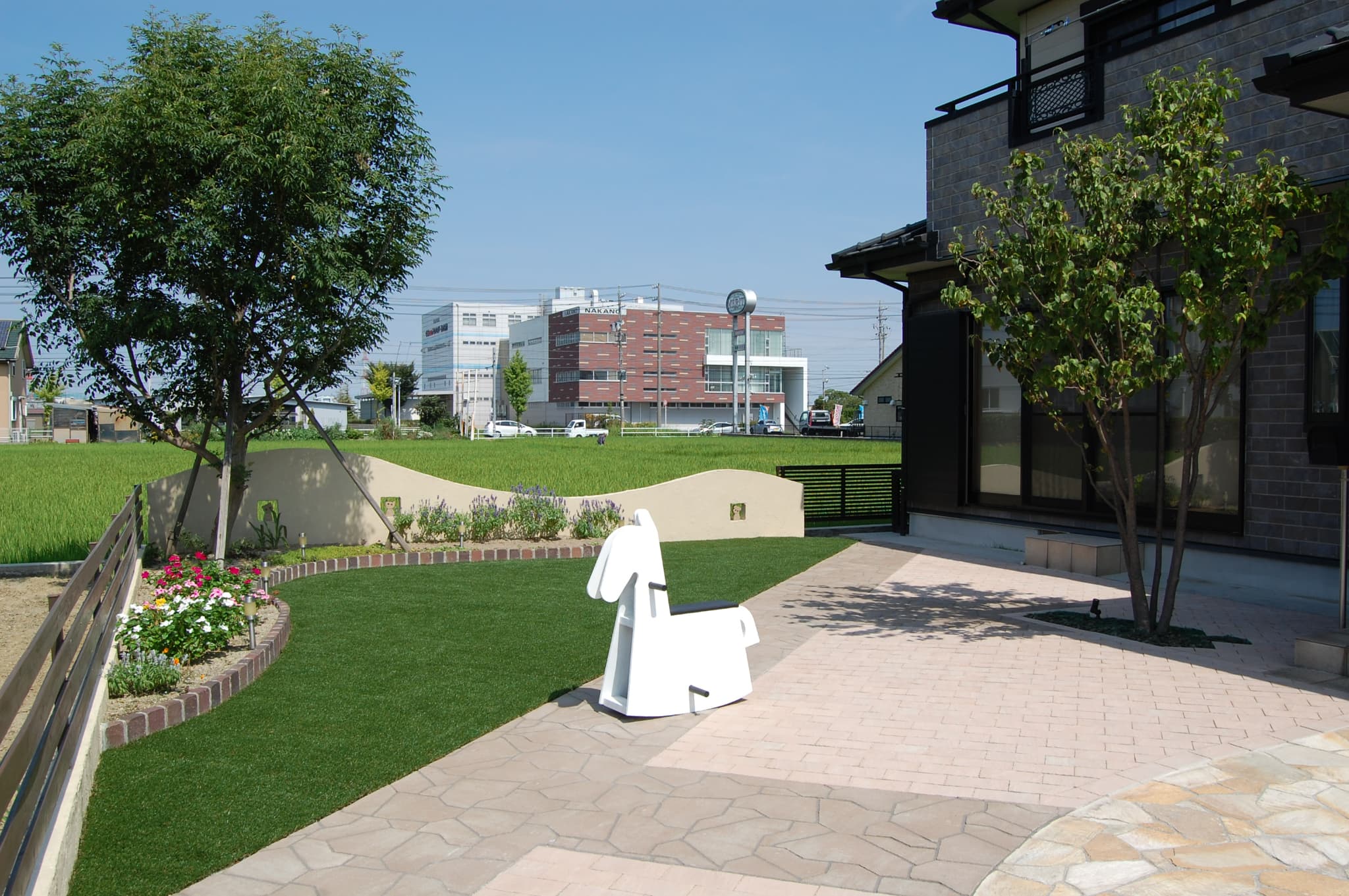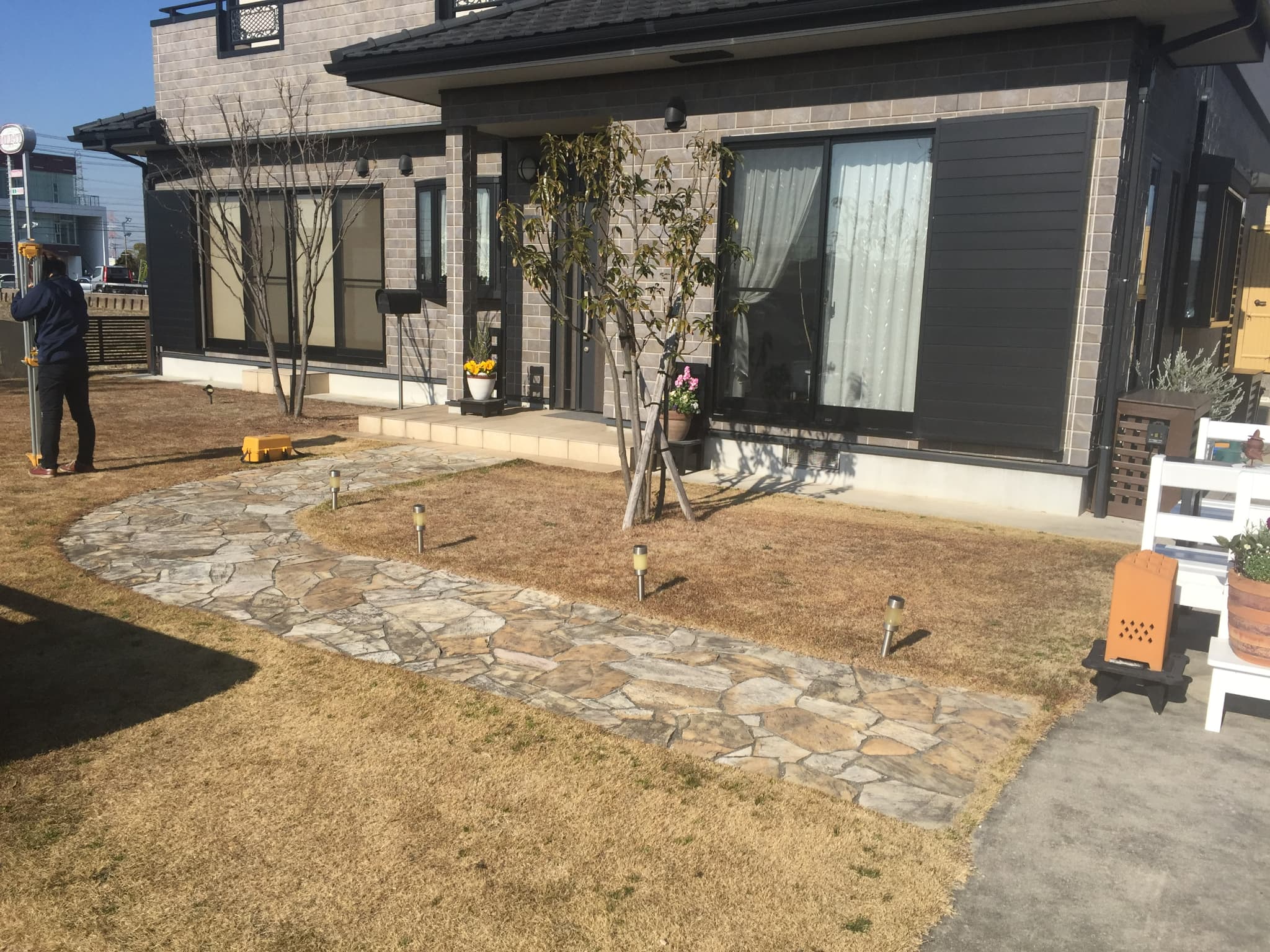 既存のアプローチや高木を残したまま、手つかずだったお庭に人工芝と透水性の舗装材を敷いて手間のかからないお洒落なお庭に仕上げました。