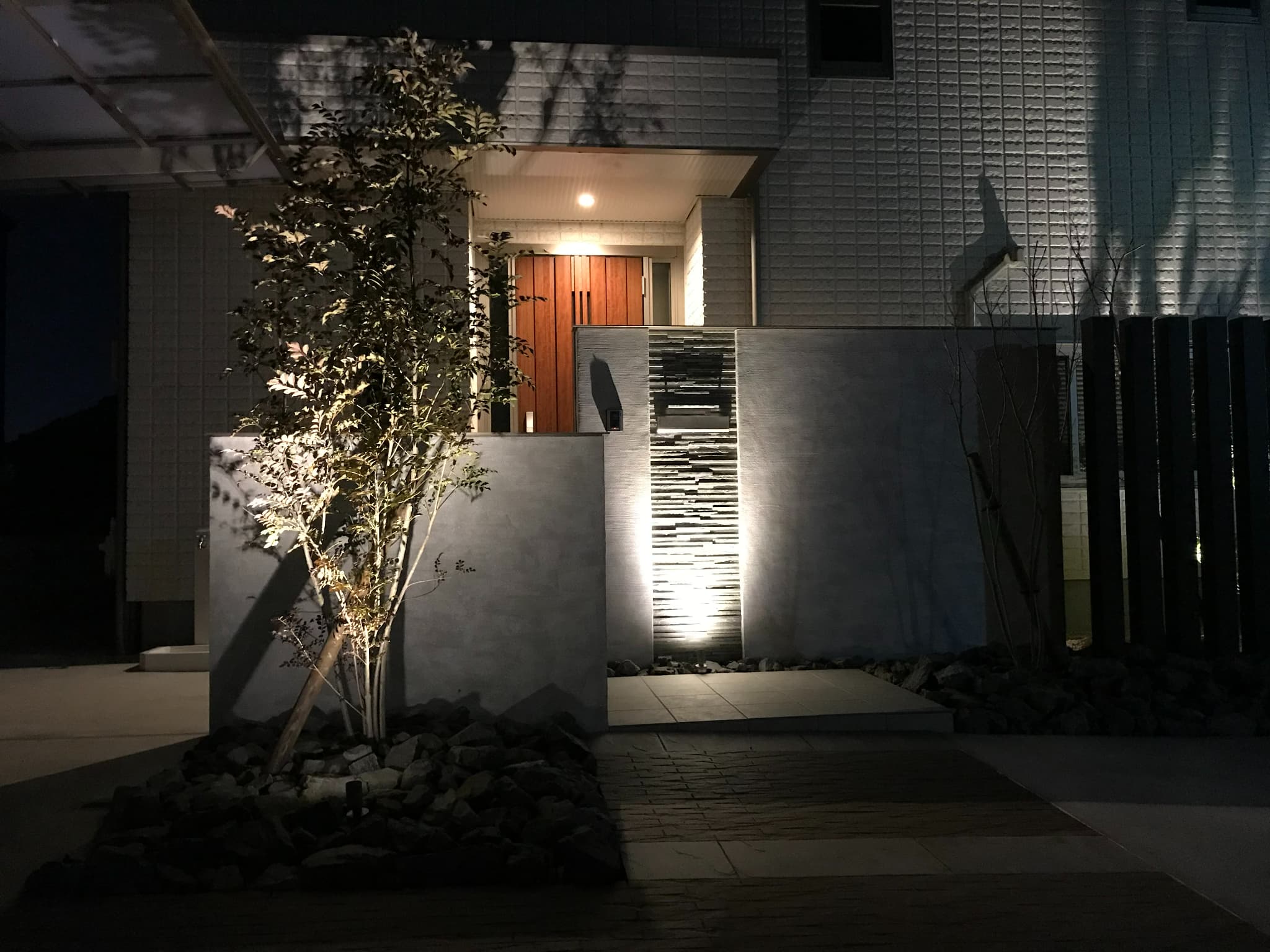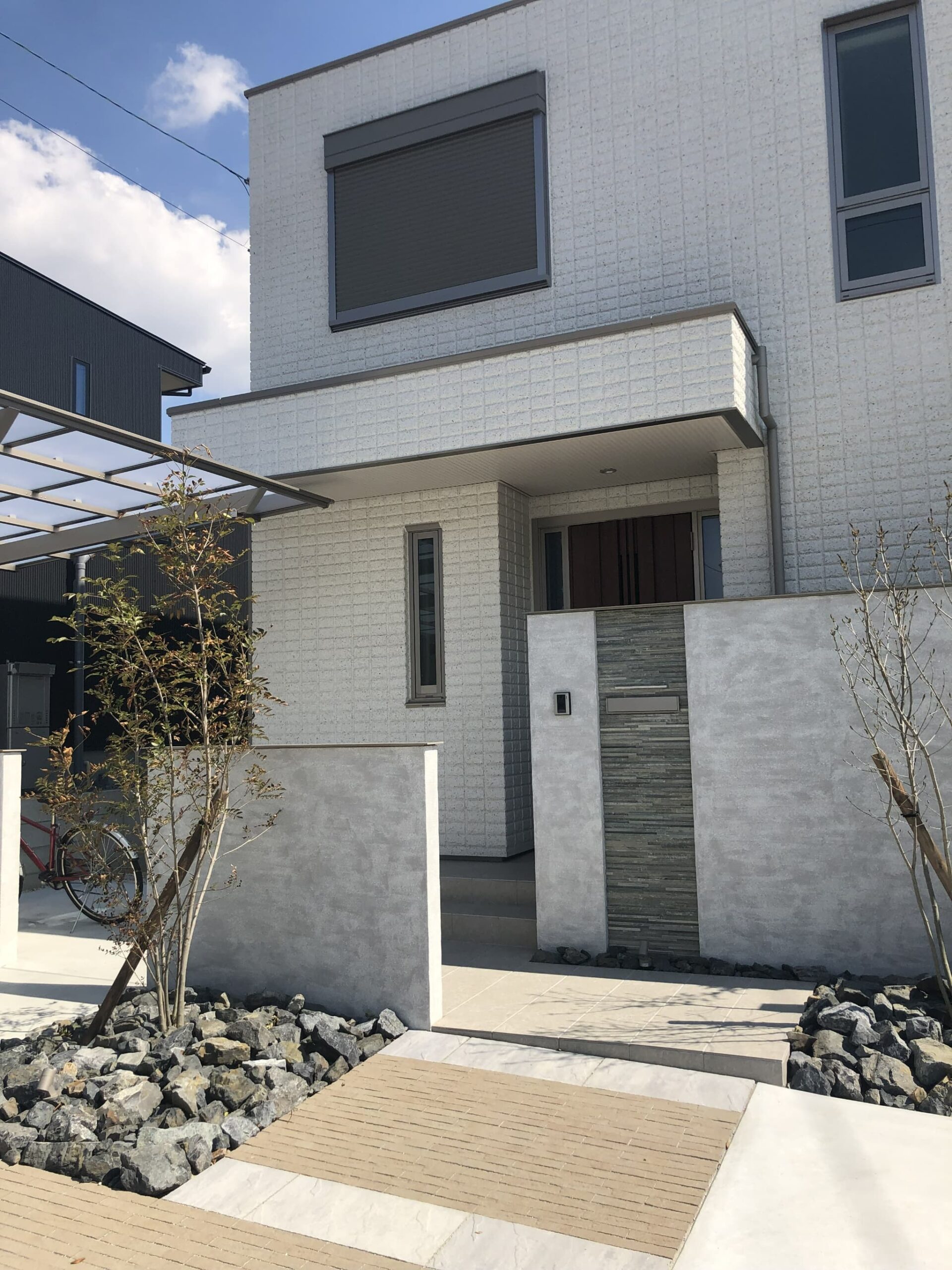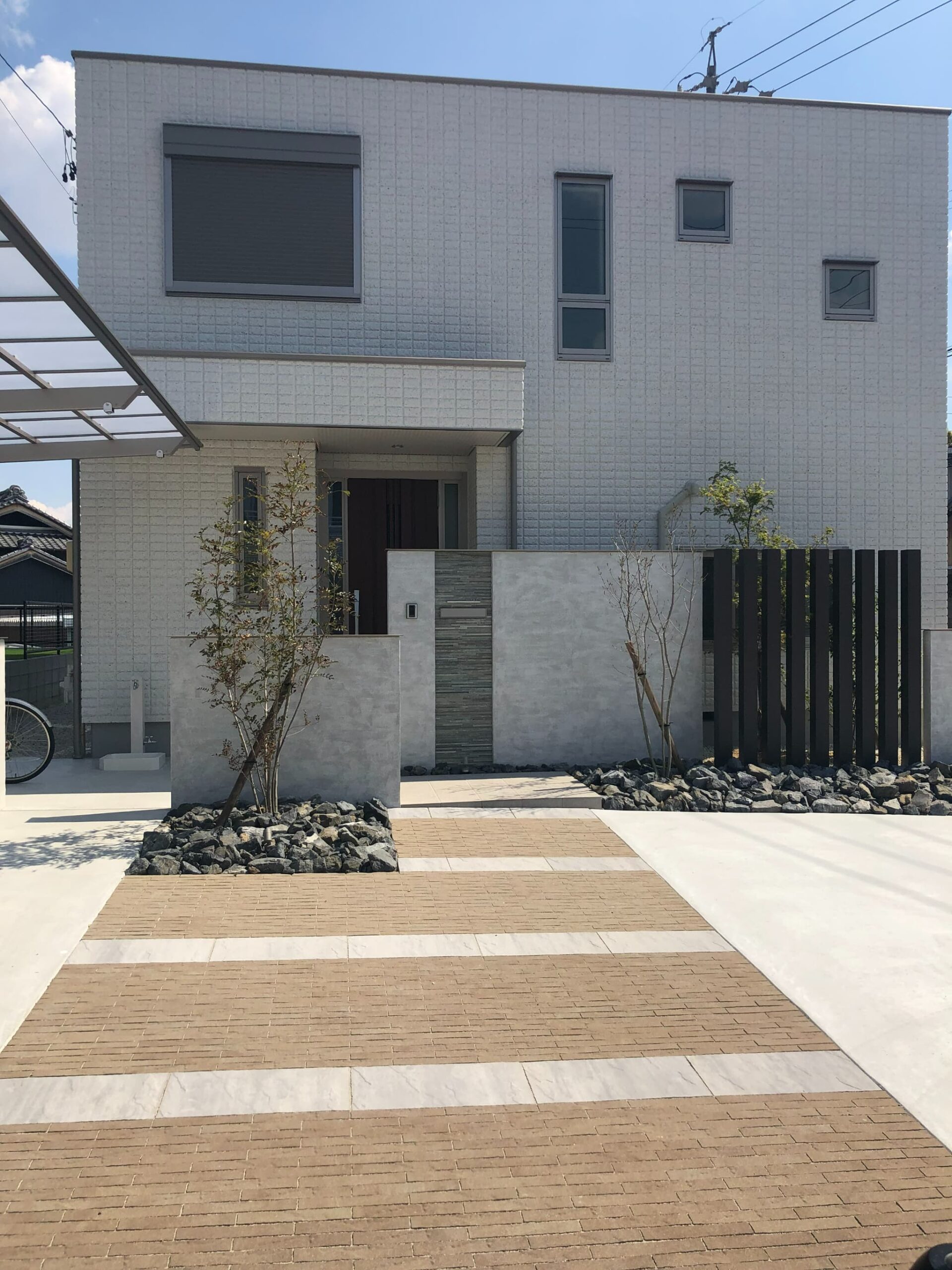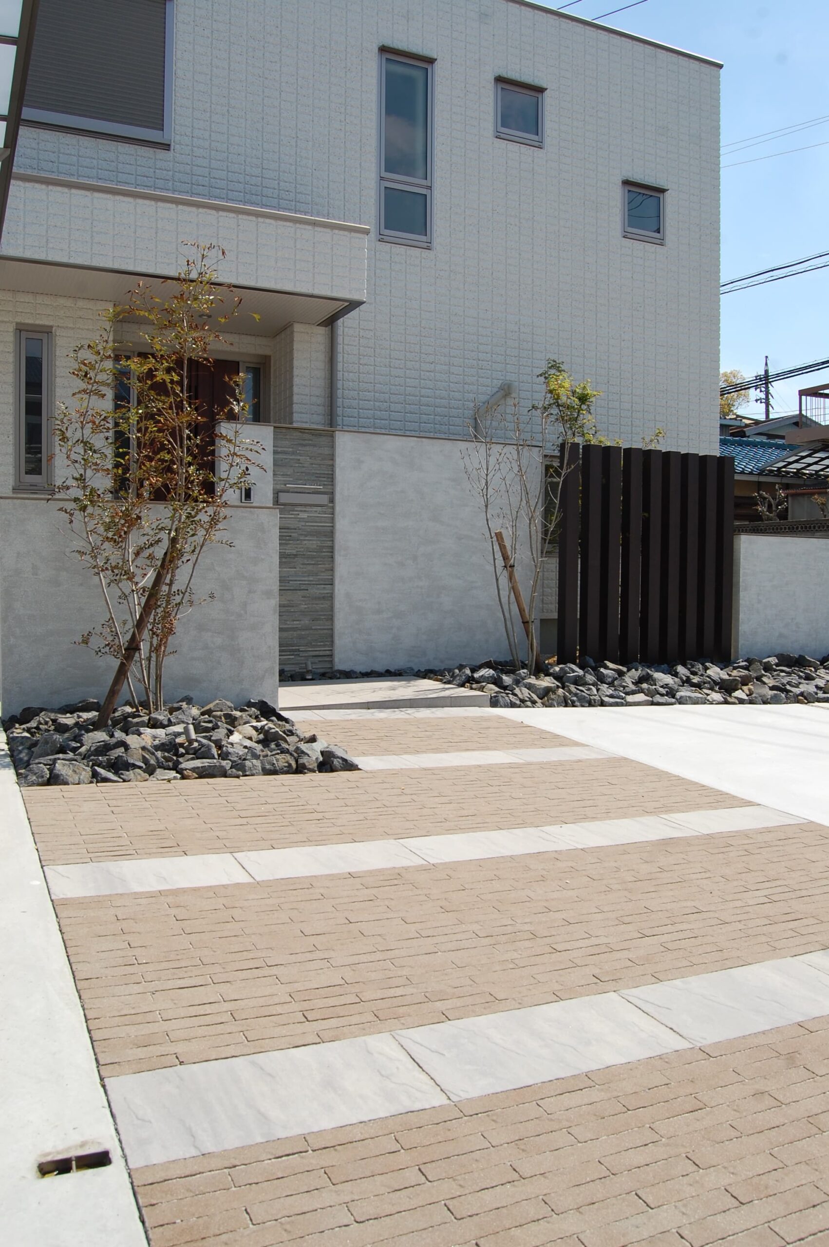 バランスよく配置した門柱は、玄関前の目隠しも兼ねています。無機質になりすぎないよう、アプローチにはアースカラーの舗装材を採用しました。