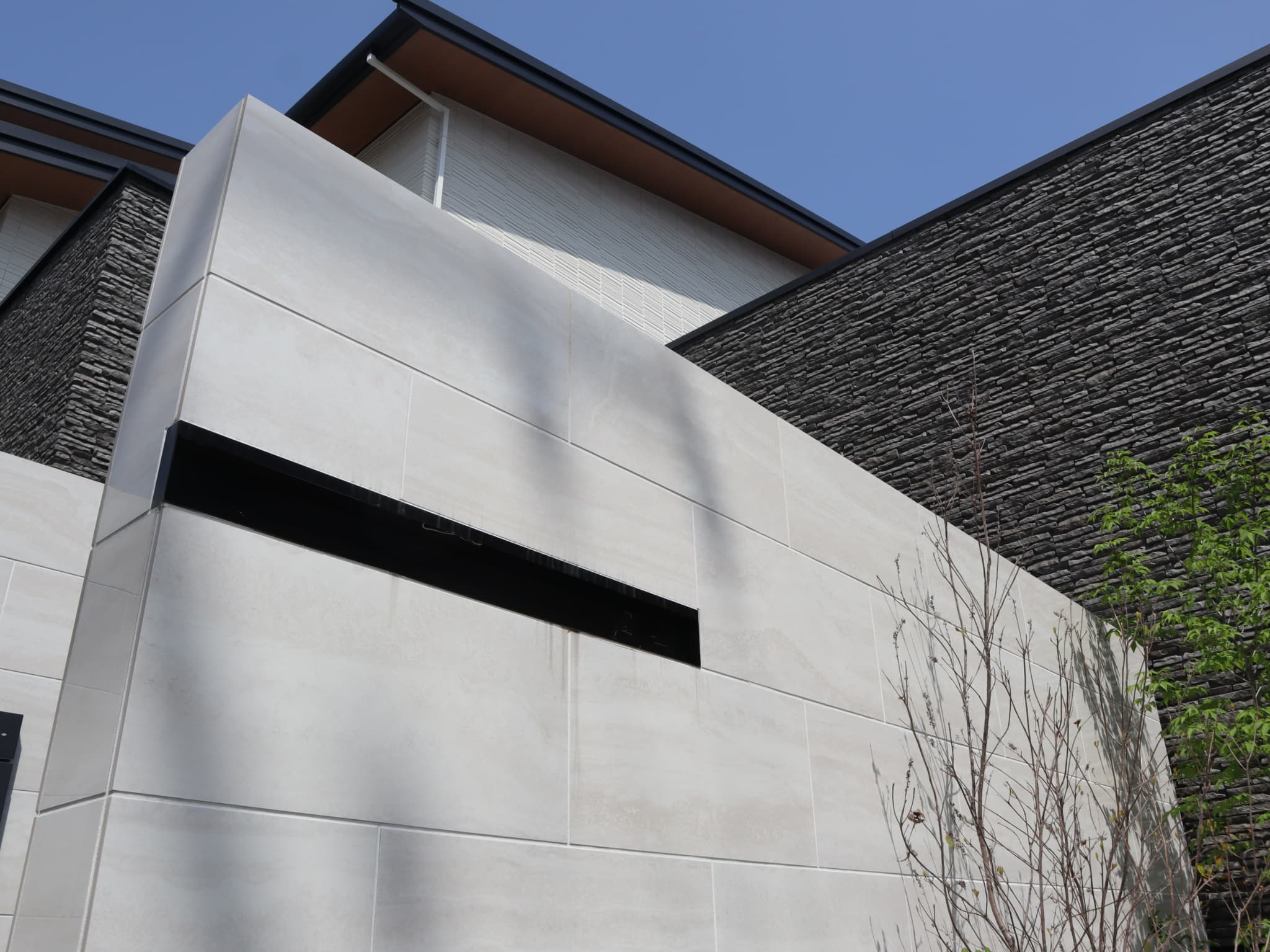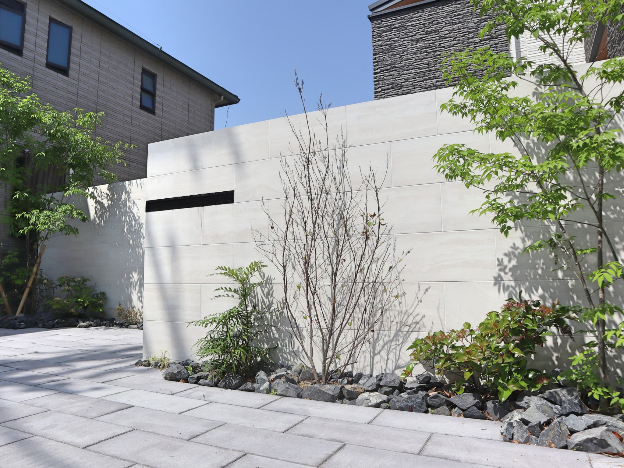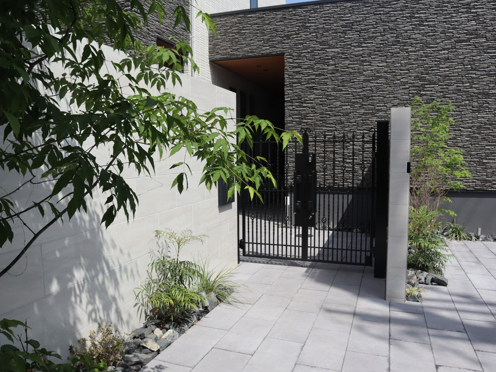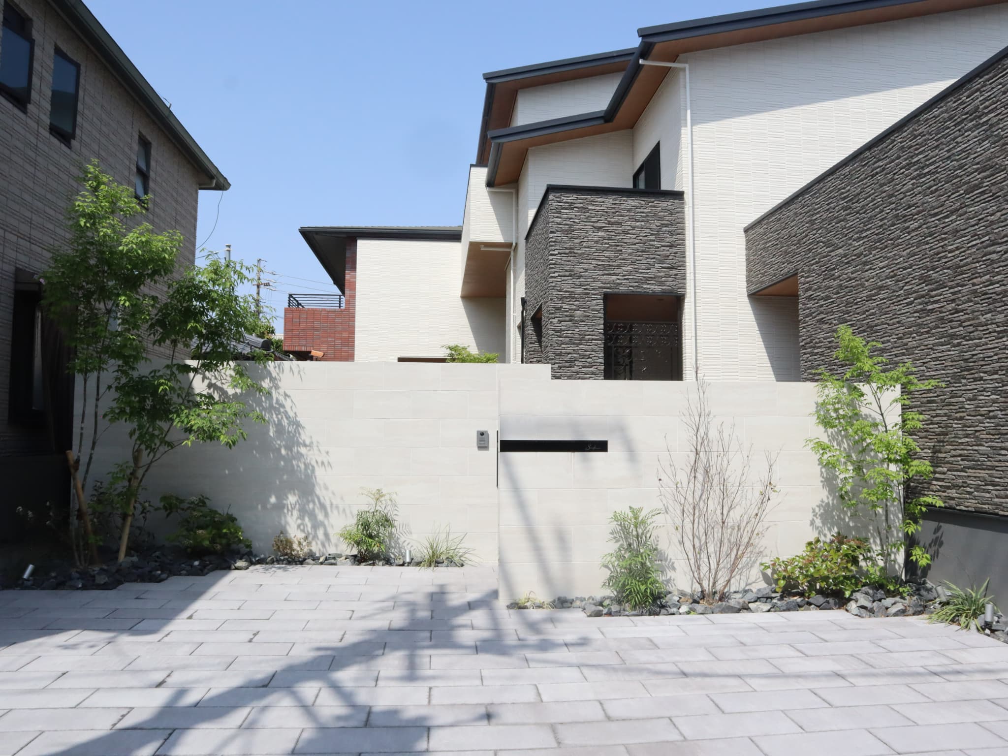 建物のボリュームに合わせウォールや樹木の高さを調整し、バランスよく配置。大理石調のタイルを合わせる事で、格調高い邸宅となりました。