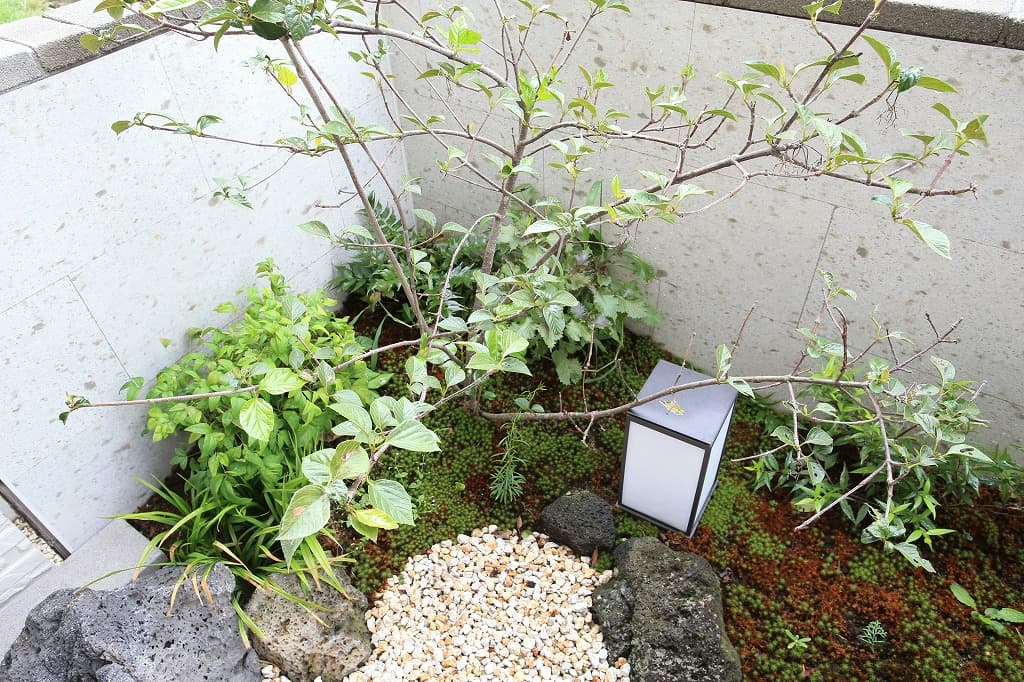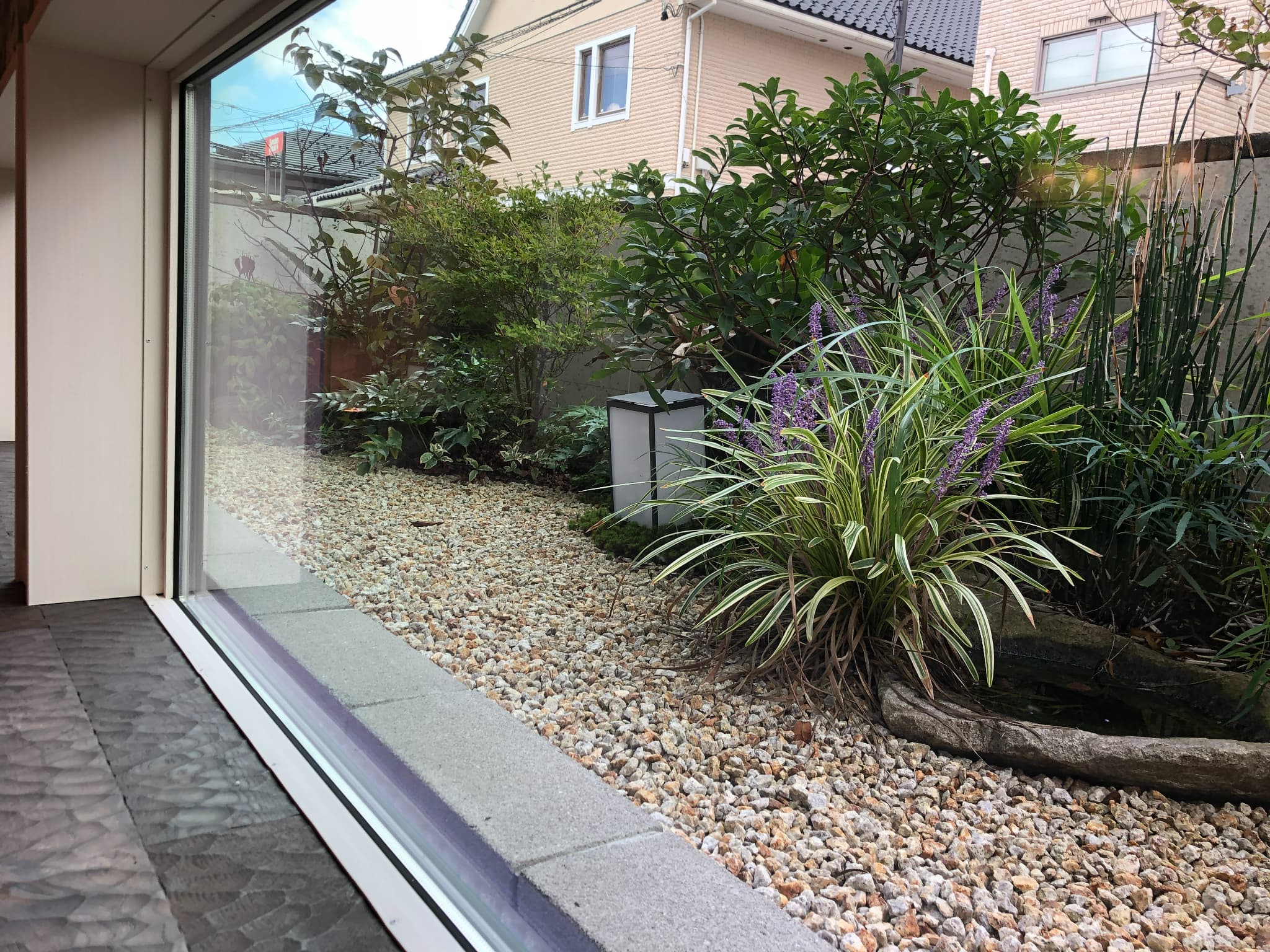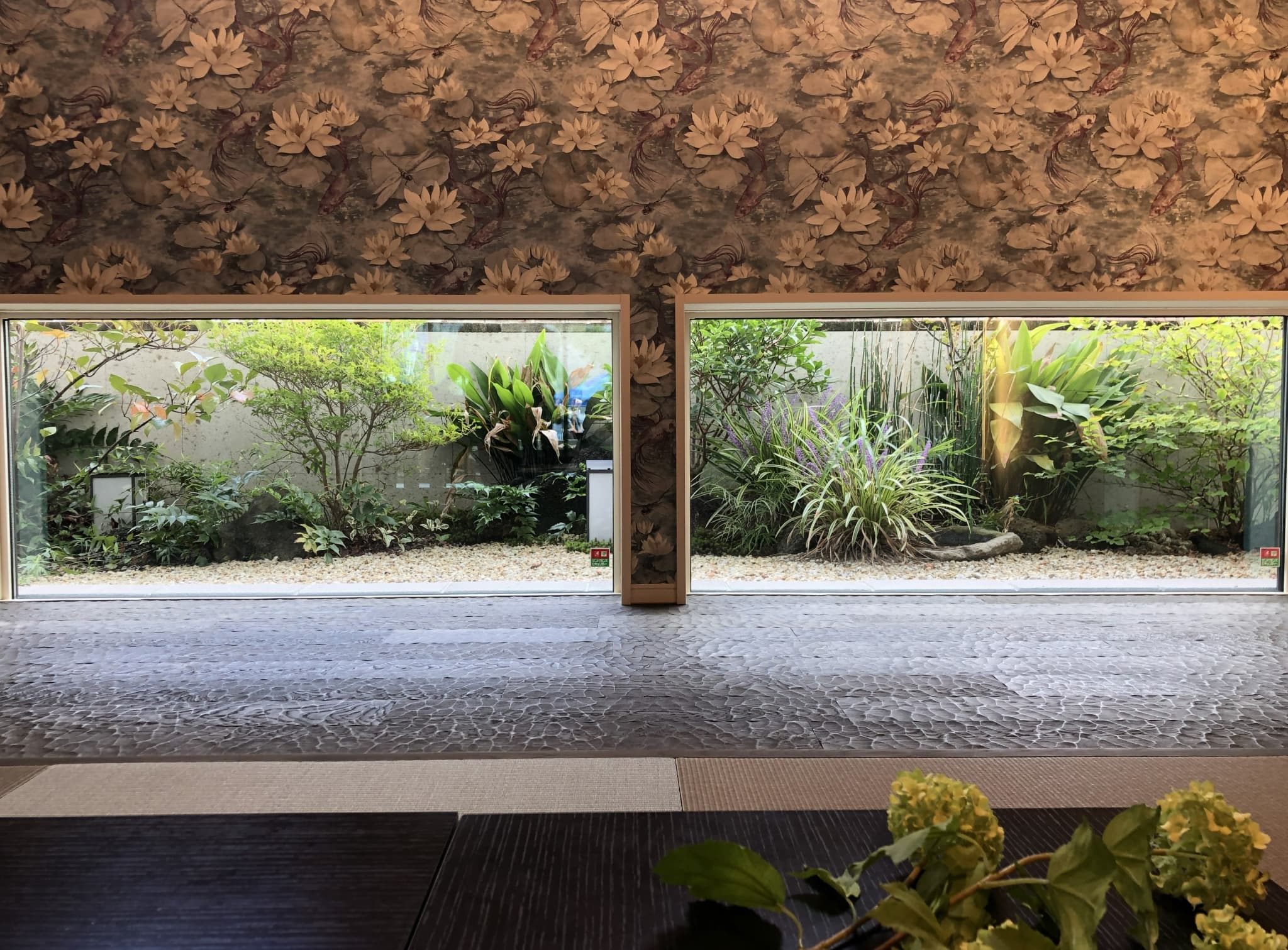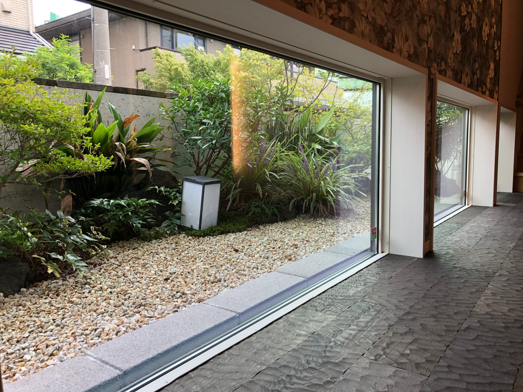 まるで料亭のような素敵な雰囲気。個性的なインテリアにも映える和風坪庭で四季折々の変化が楽しめます。