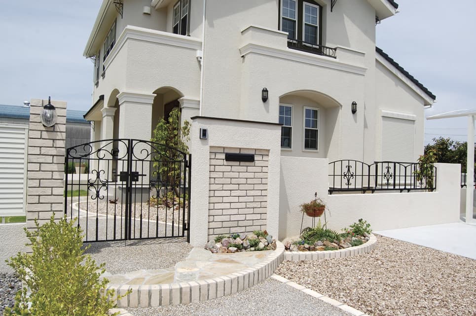 白を基調とした優雅なファサード。レンガや天然石、アイアンが持つ素材の個性を活かし柔らかな雰囲気に仕上げました。