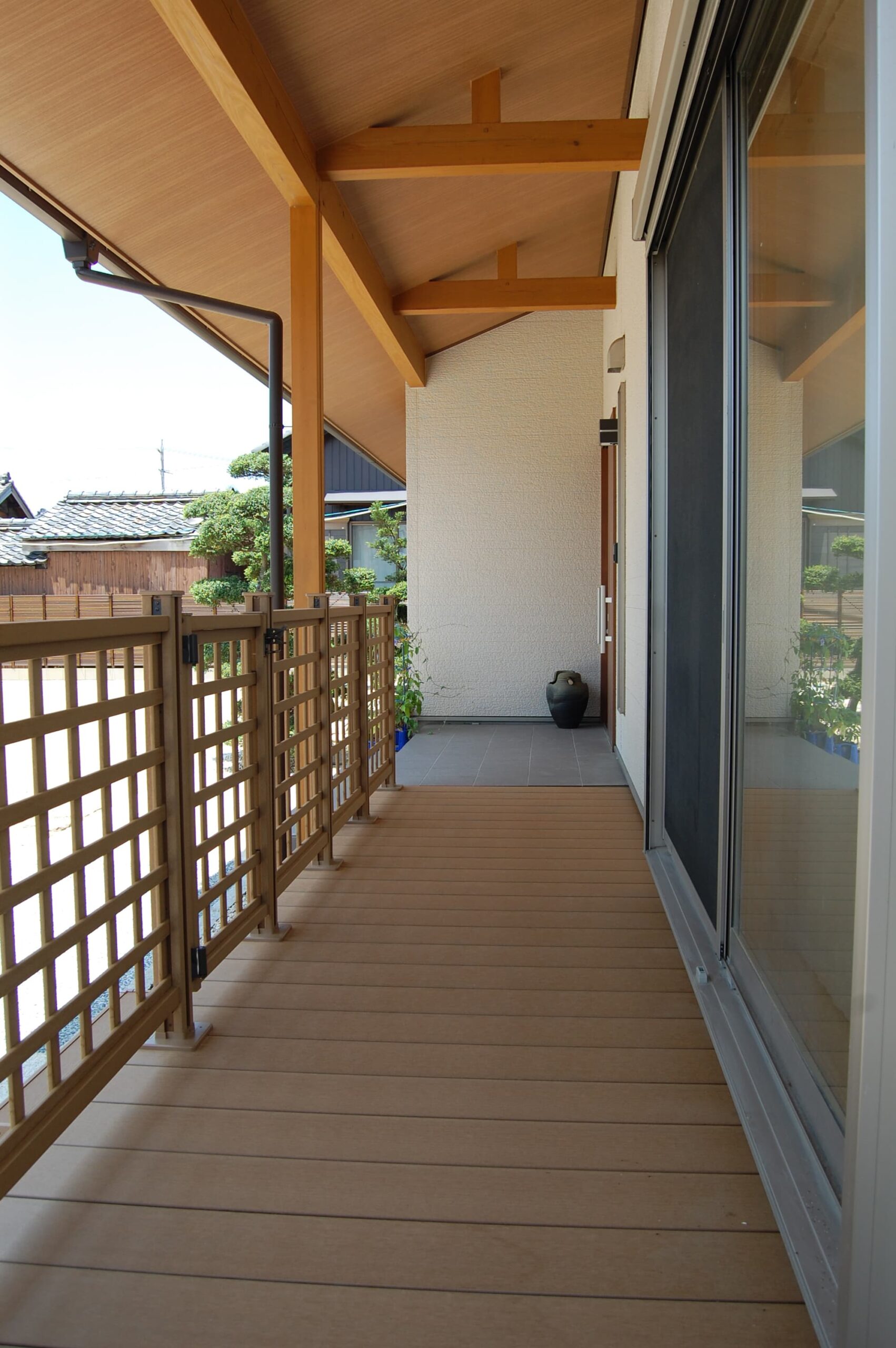 和モダンなウッドデッキとウッドフェンス