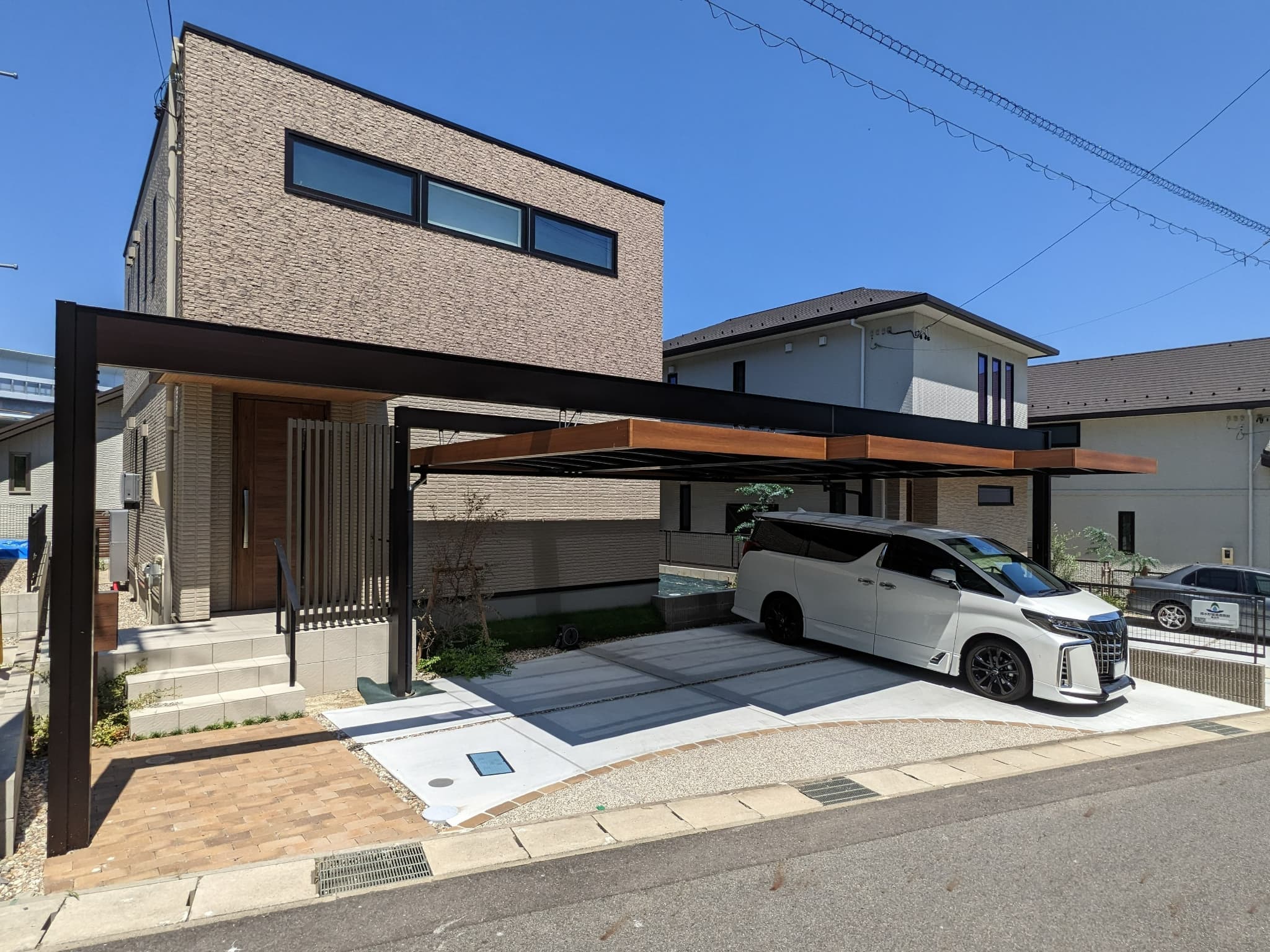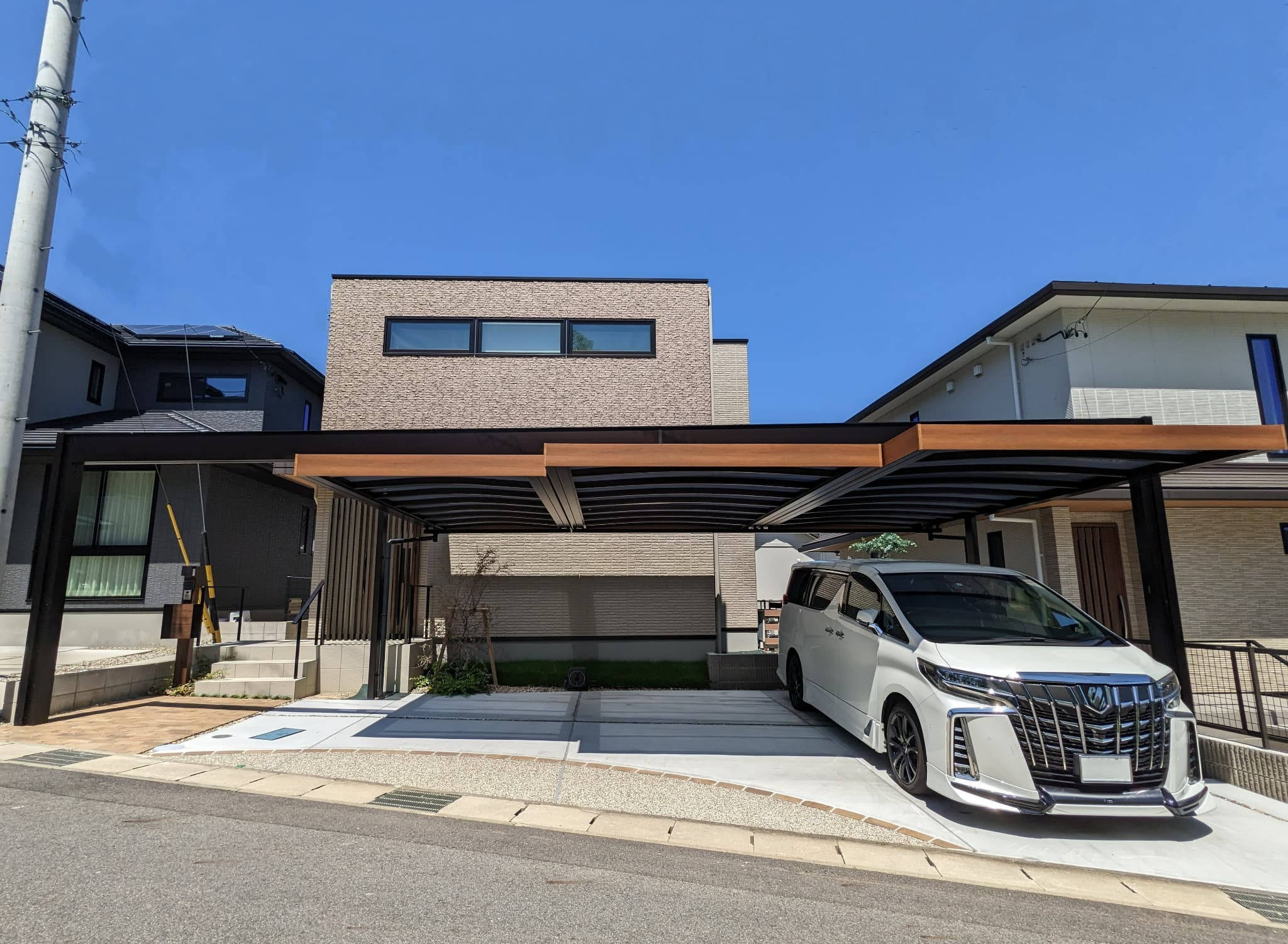 前面道路の角度に合わせて奥行き違いの屋根を連結しました。広い間口の敷地から変形敷地まで、様々な納まりでカバーできる自在性・デザイン性を追求したカーポートです。三協アルミ Uスタイルアゼスト