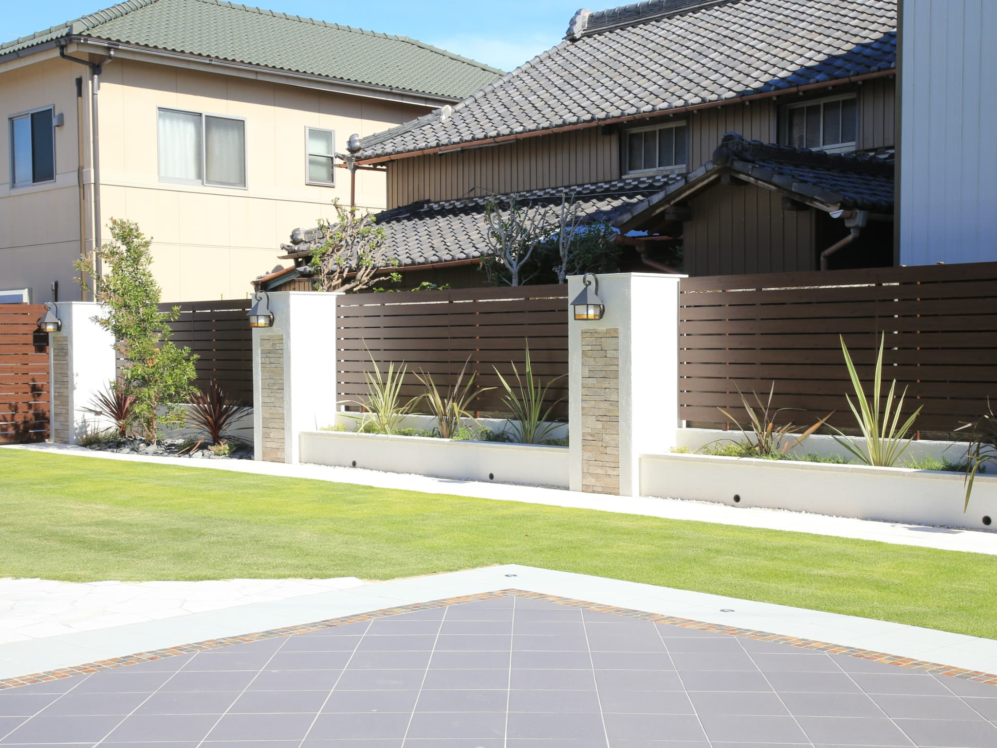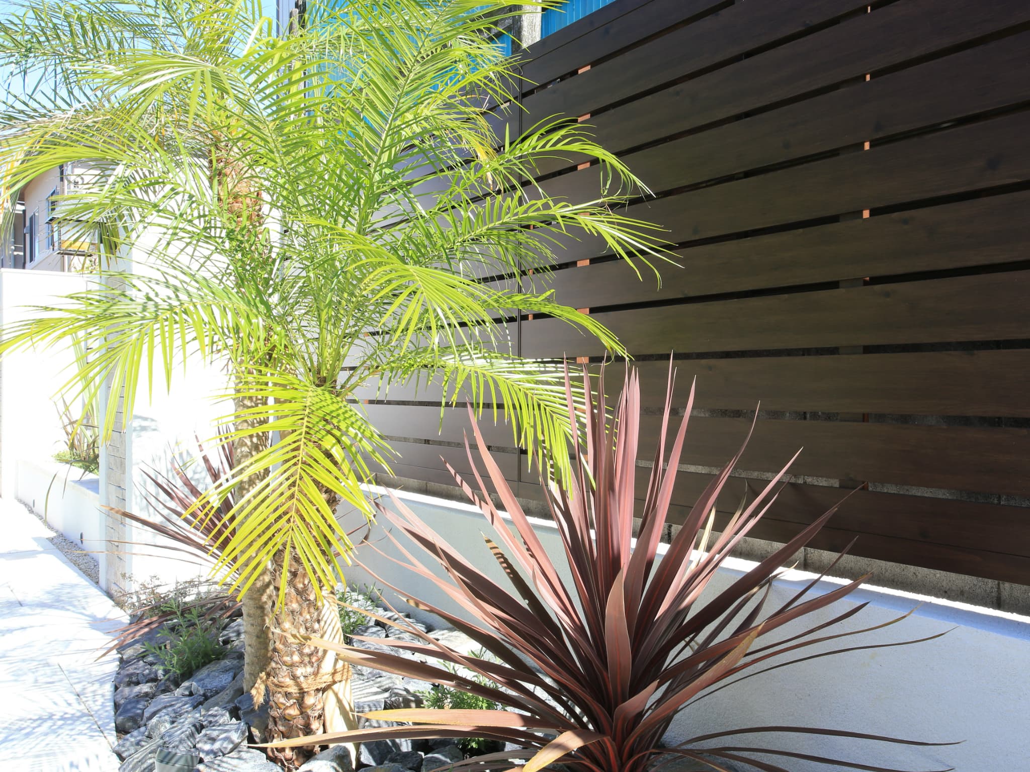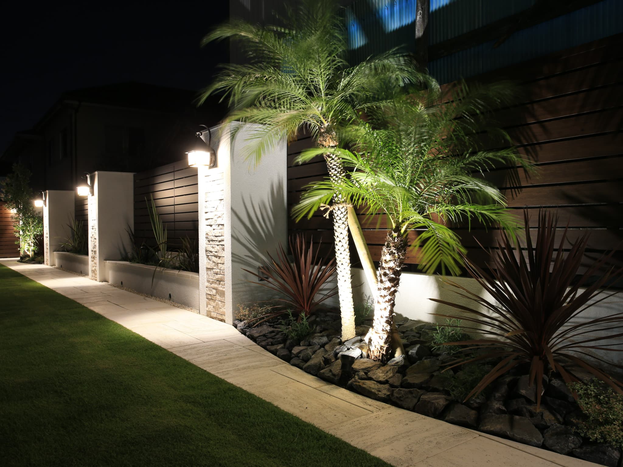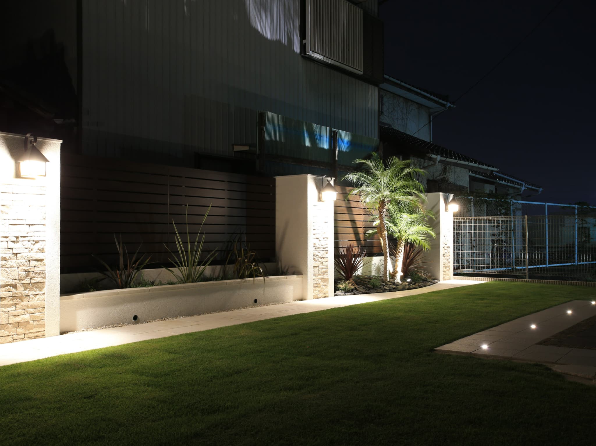 リゾートにいるような優雅なひとときを感じることができるお庭です。ライトが植栽や石材を照らし、ラグジュアリーな空間を演出します。