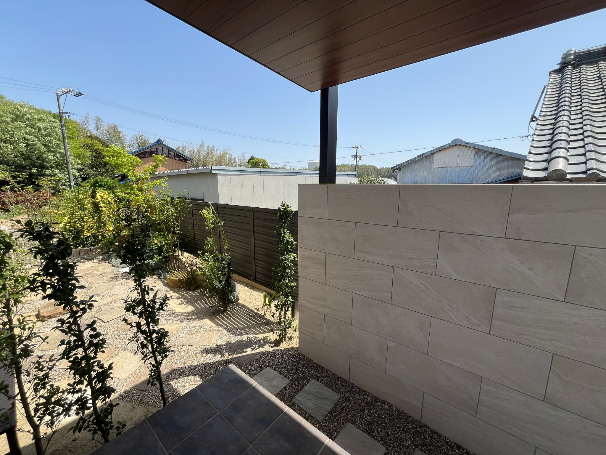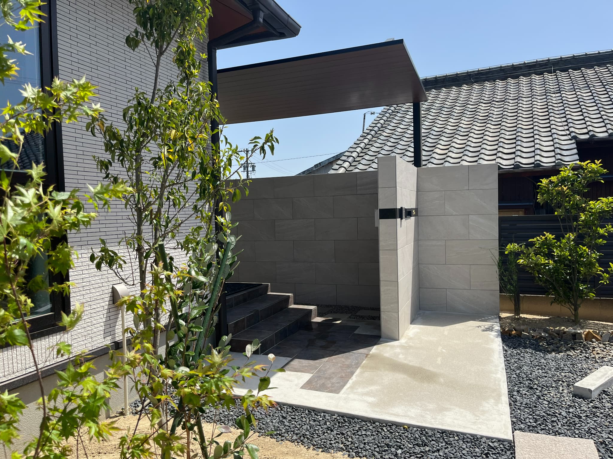 玄関からポストまで雨でも濡れずに行けるようSCを設置。塀はタイルで仕上げて汚れも付きにくく見た目もきれいに仕上がりました。