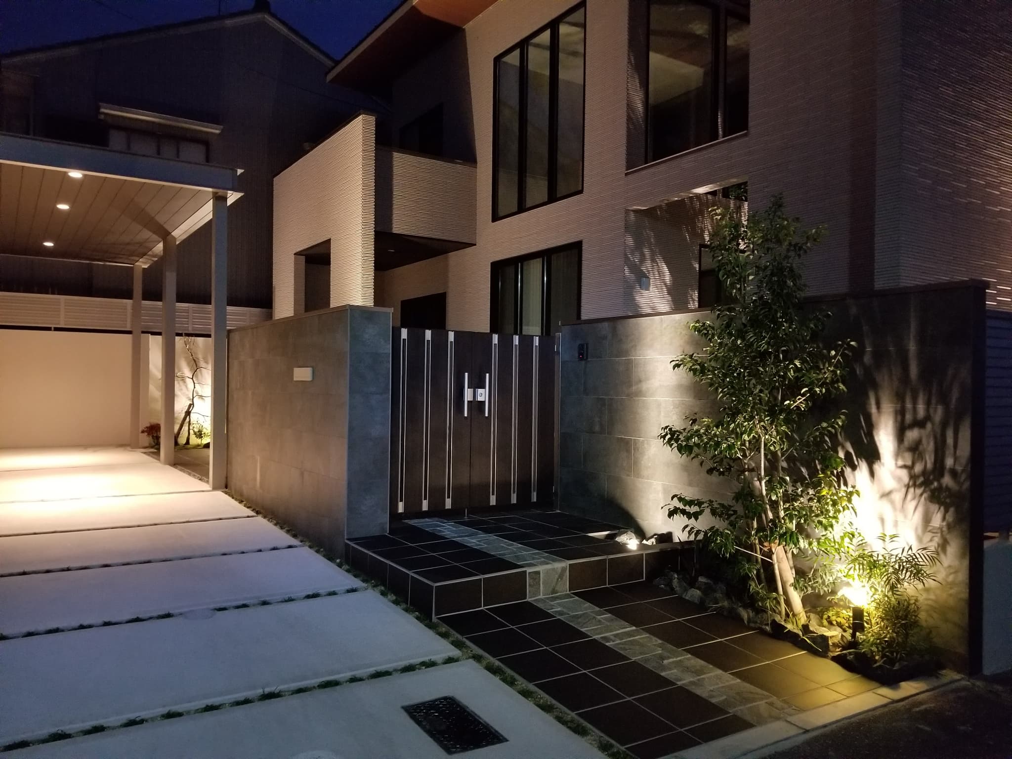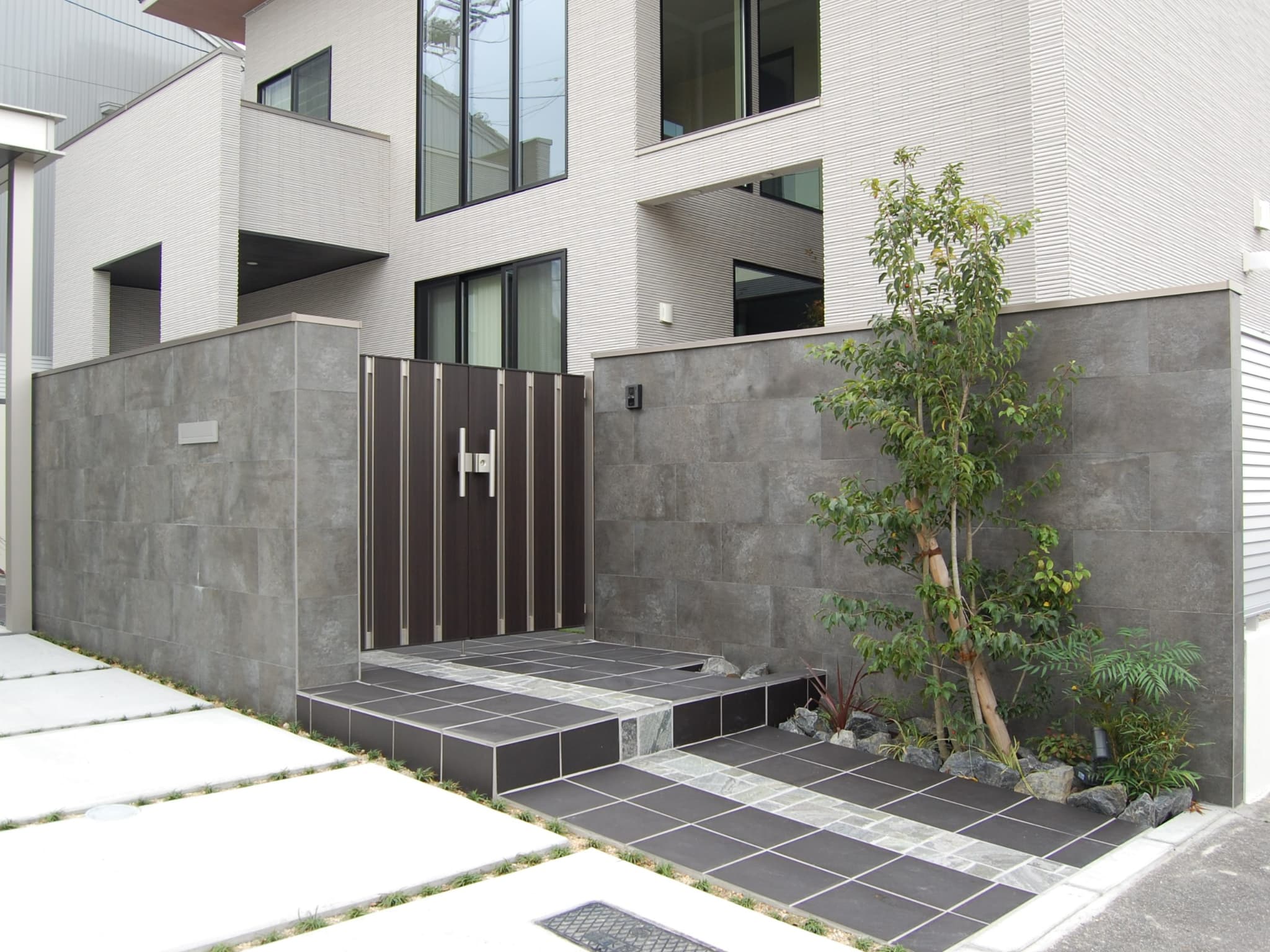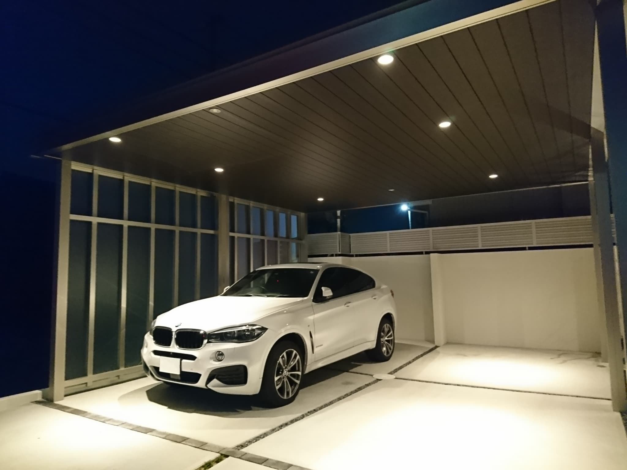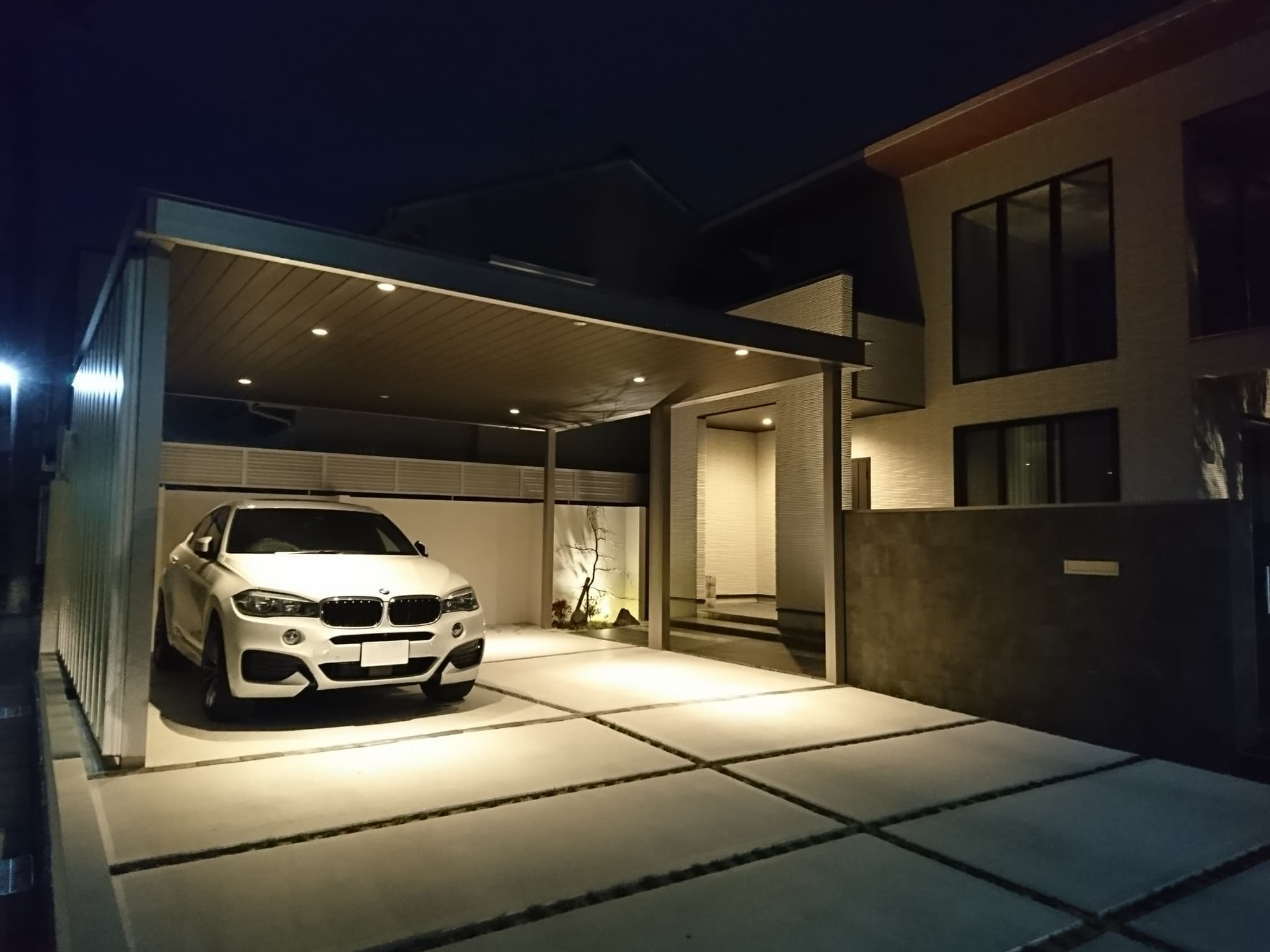 直線ラインを強調するダイナミックな印象のファサード。ガレージのようなスタイリッシュなカーポートと空間を仕切る大判タイルの意匠壁が魅せるワンランク上のエクステリアです。