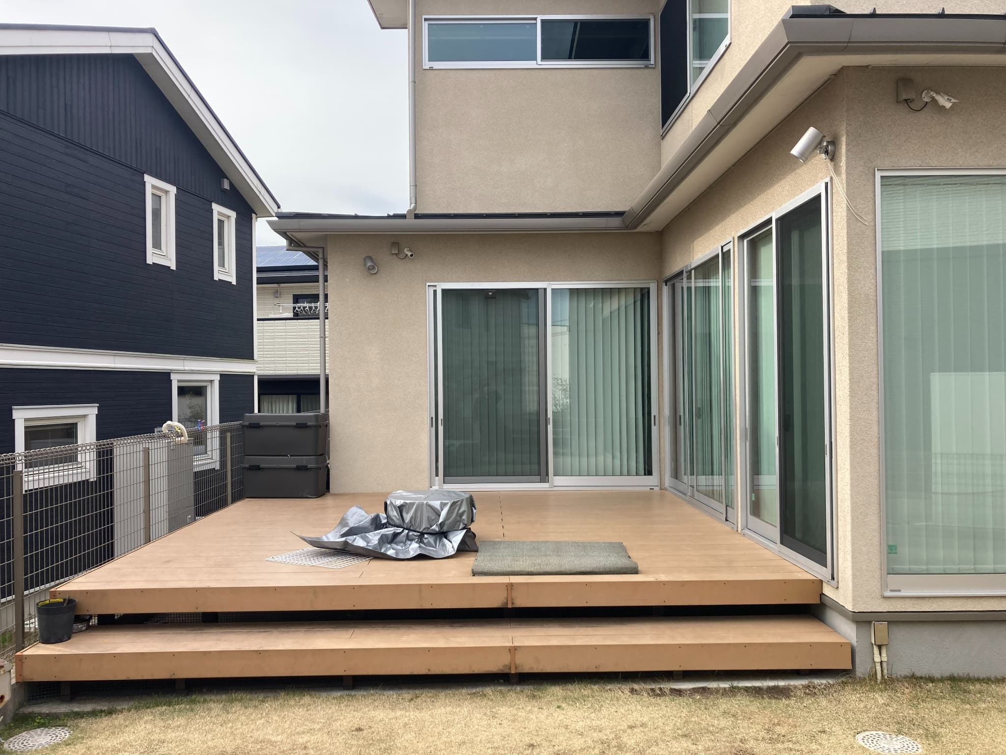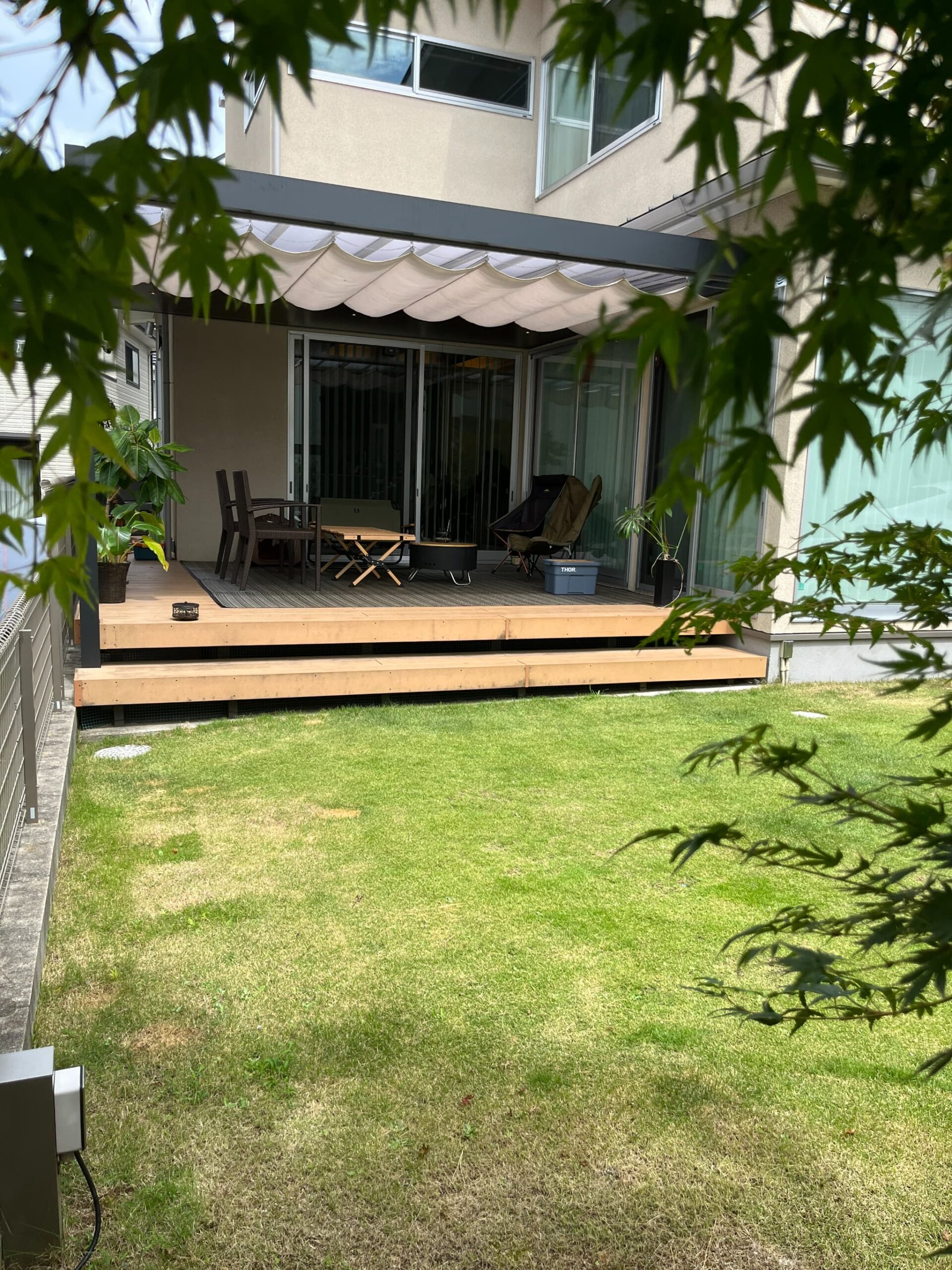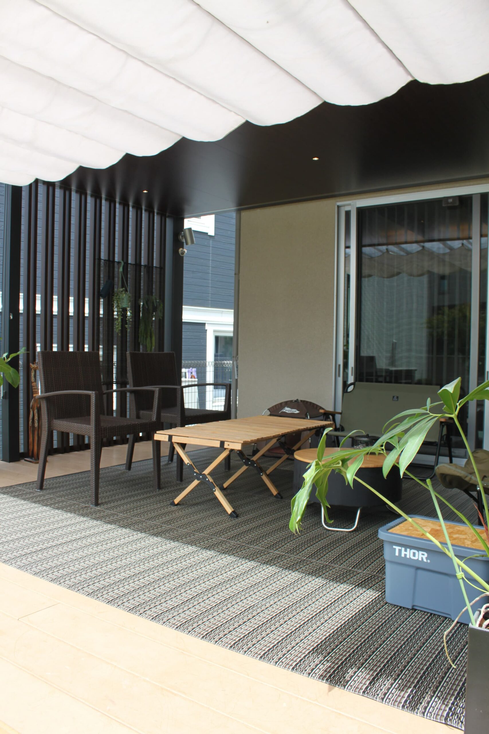内天井のあるテラスやシェード、スリットを使用することでお庭に新しい付加価値が生まれ、家族や仲間と楽しく過ごせるアウトドアリビングになりました。タカショー ホームヤードルーフ