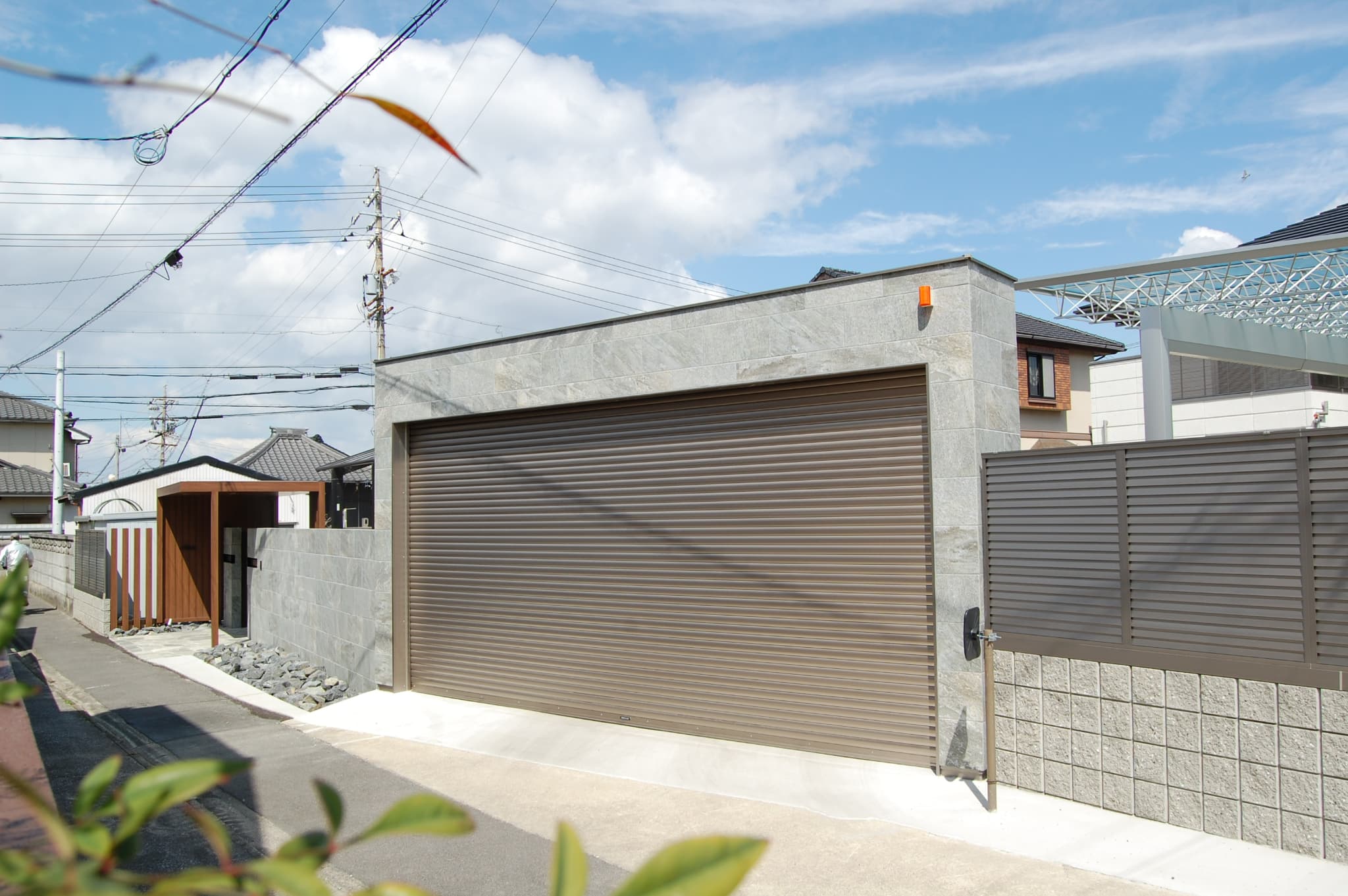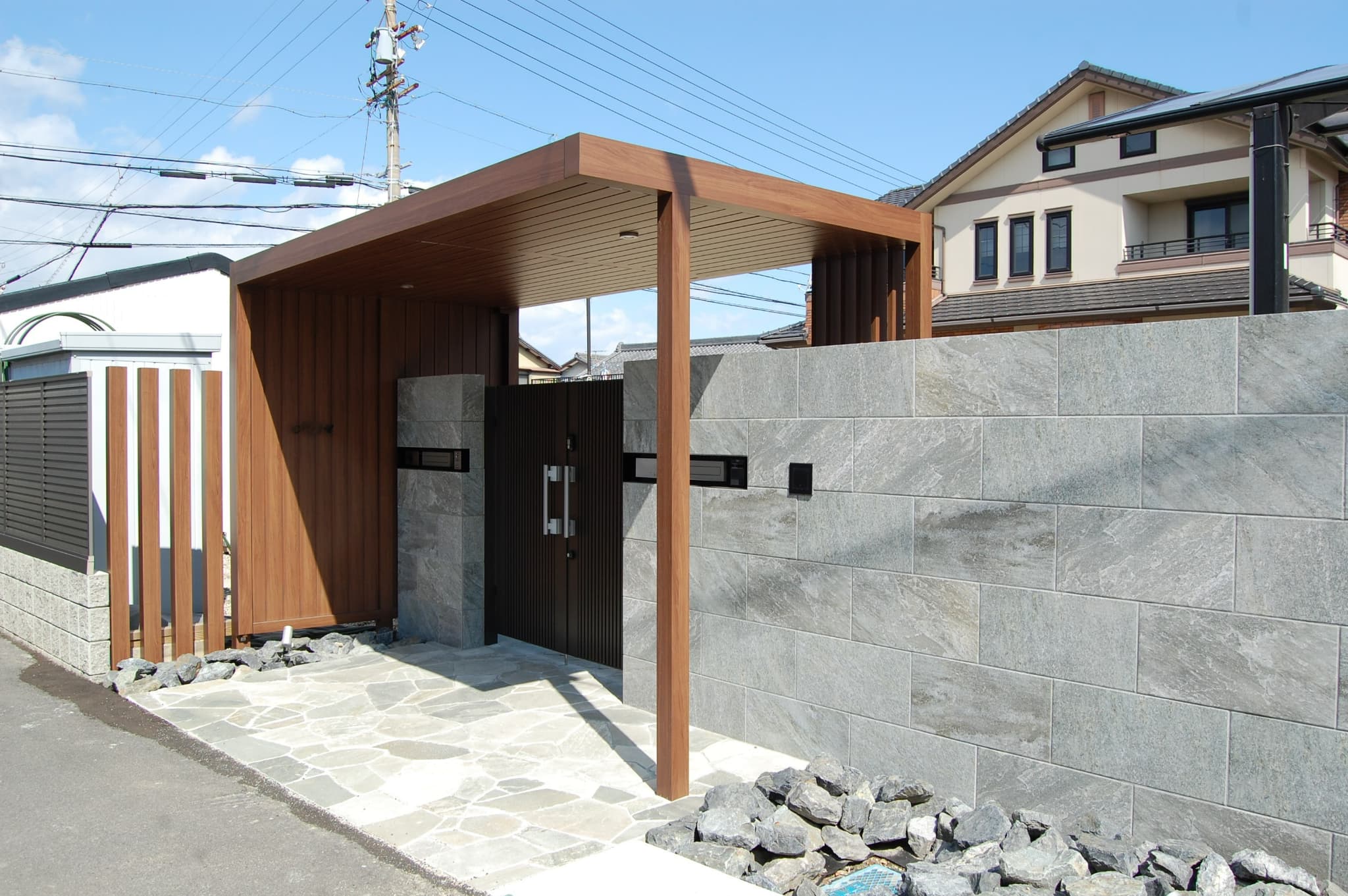 天然石調のタイルを貼った門柱と天然石のアプローチ。落ち着いた木目調の屋根付きのエントランス。