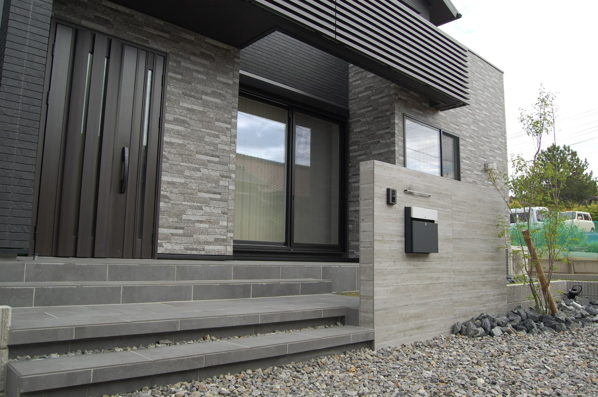窓を隠す幅広の門柱、玄関ポーチと同じタイルを使用して作った蹴込のある階段が特徴の外構です。