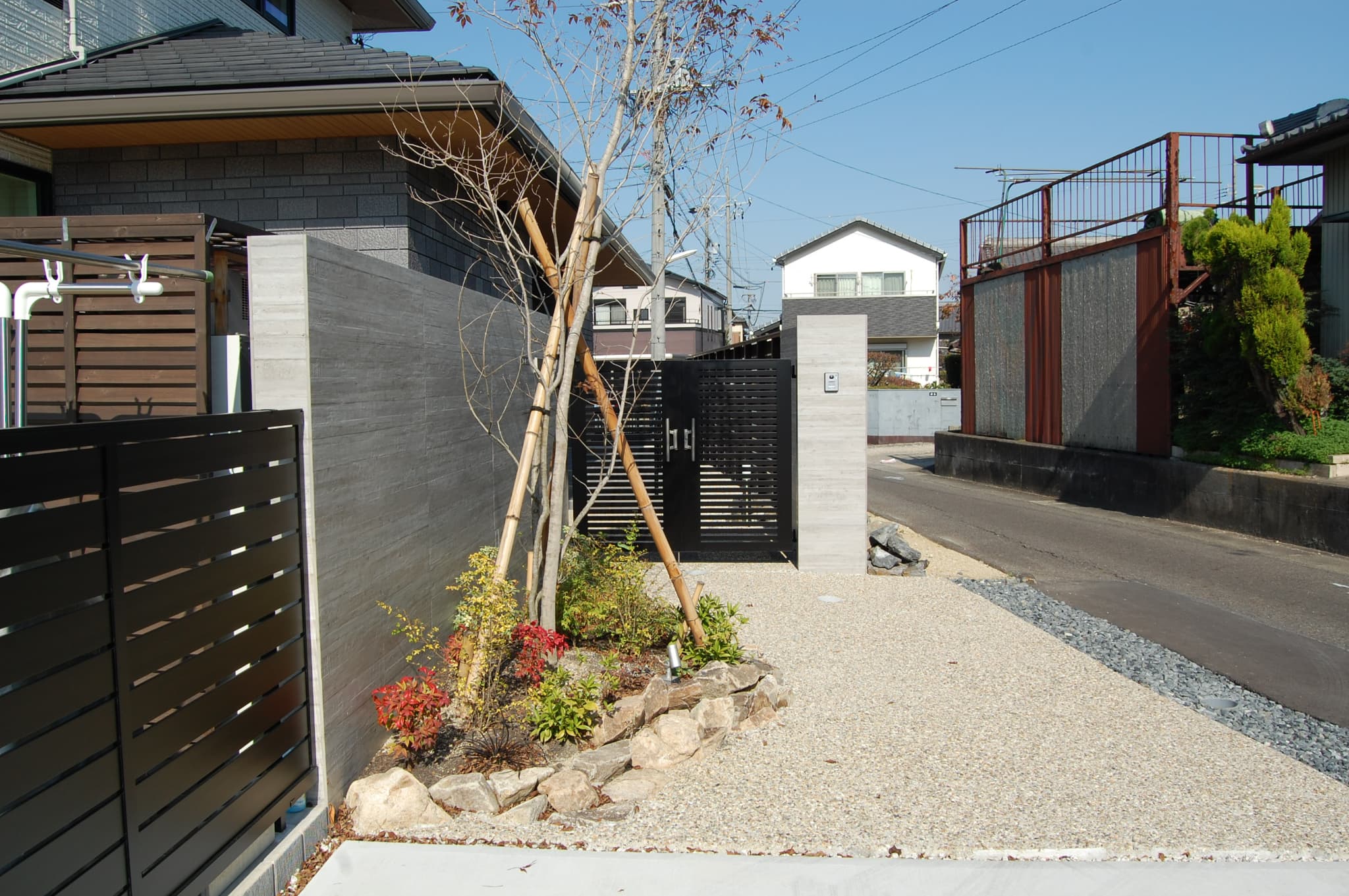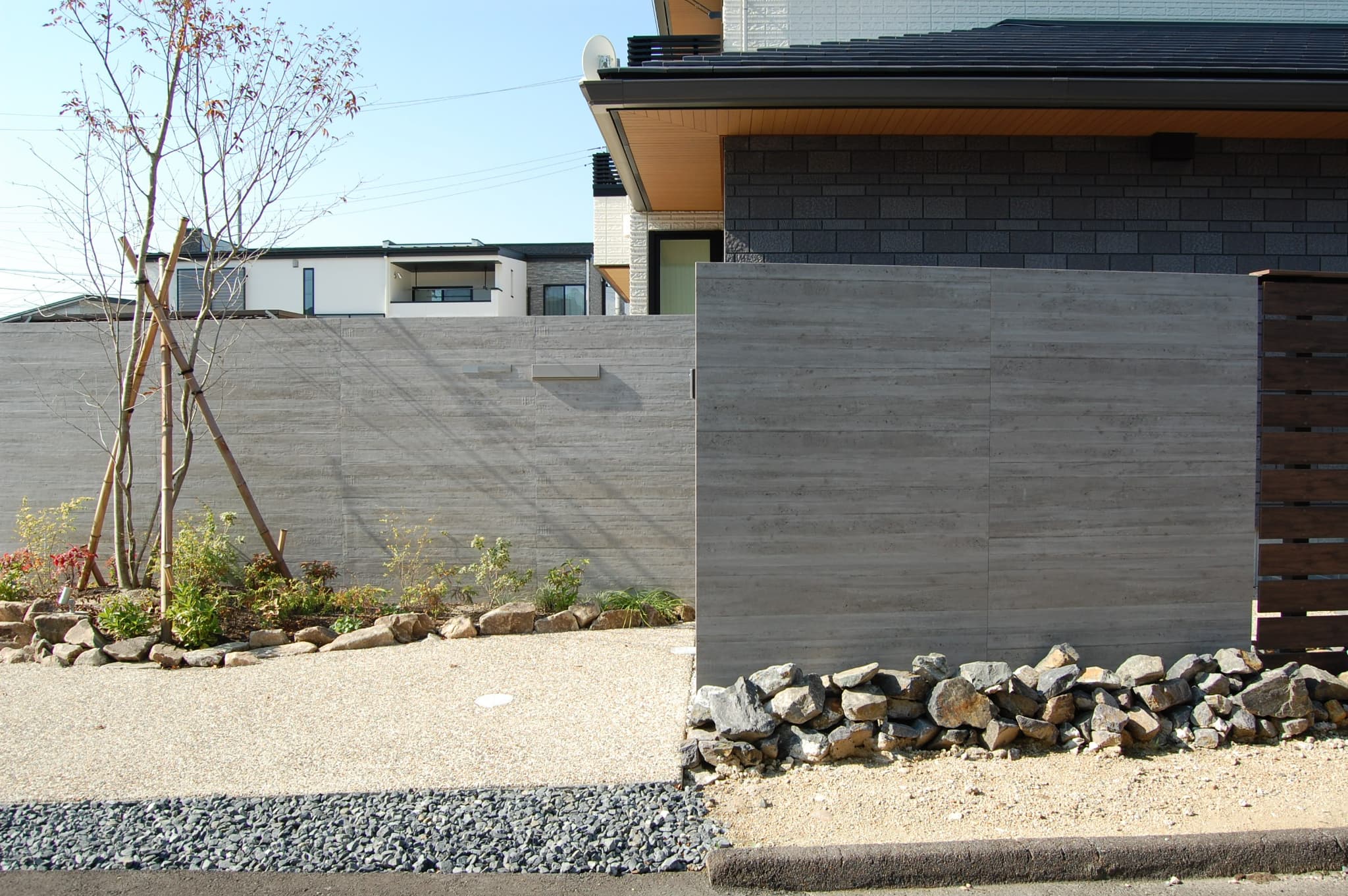 広い間口に見合う大きなデザイン塀を設け迫力のある空間を演出。玄関前の目隠しになるよう門柱とフェンスの高さを揃え機能性にも配慮しました。