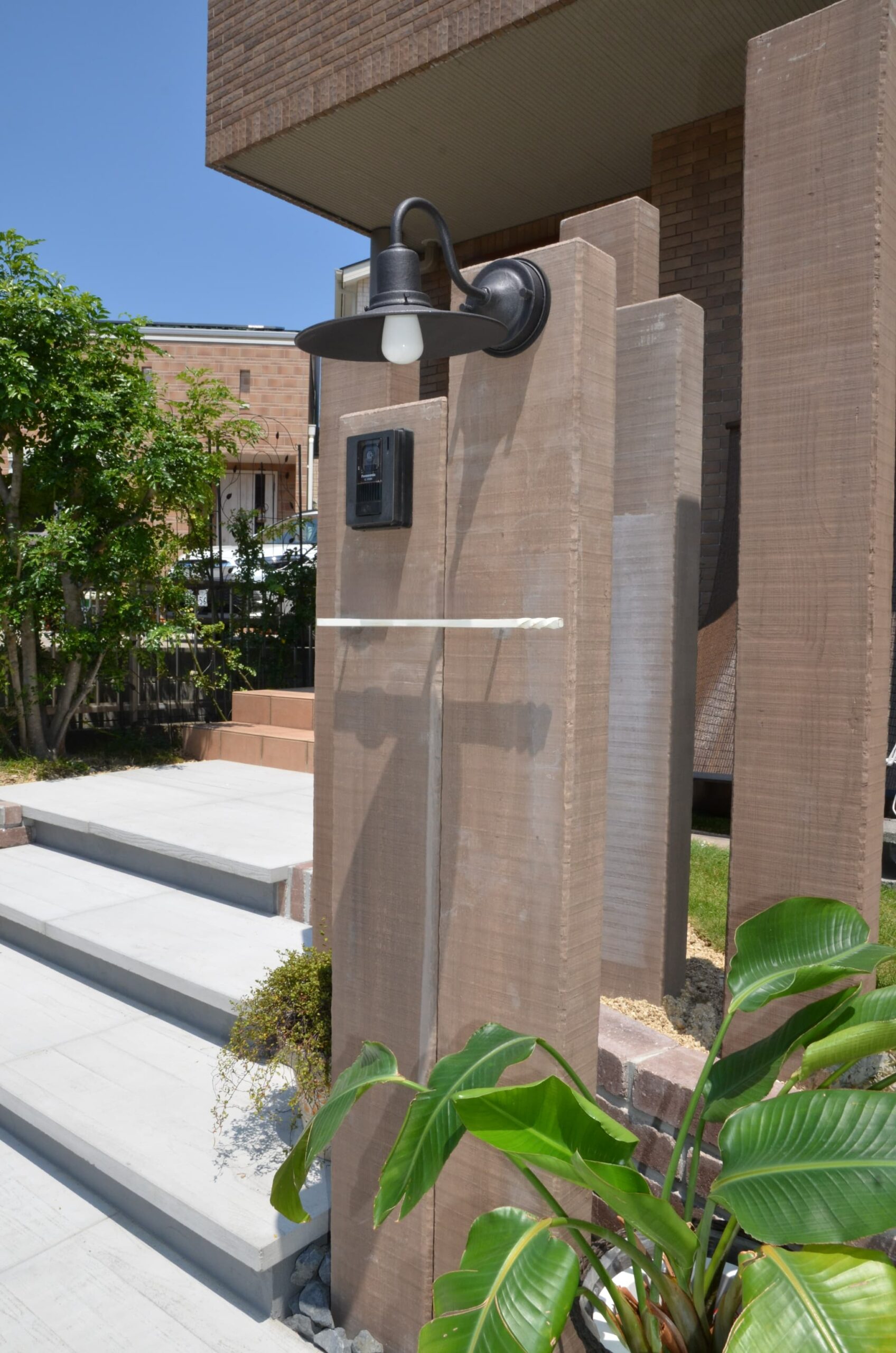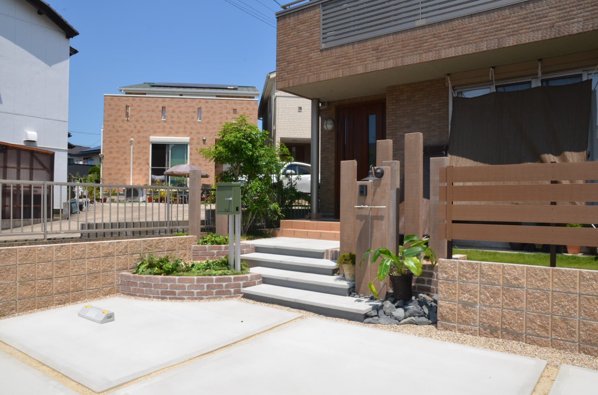 駐車場を広げるとともに門まわりもリフォーム。リズミカルな階段脇には花壇を配置して既設の草花を楽しめる空間になりました。