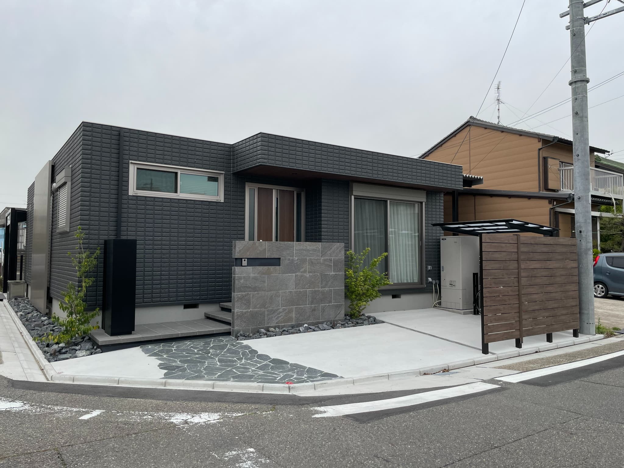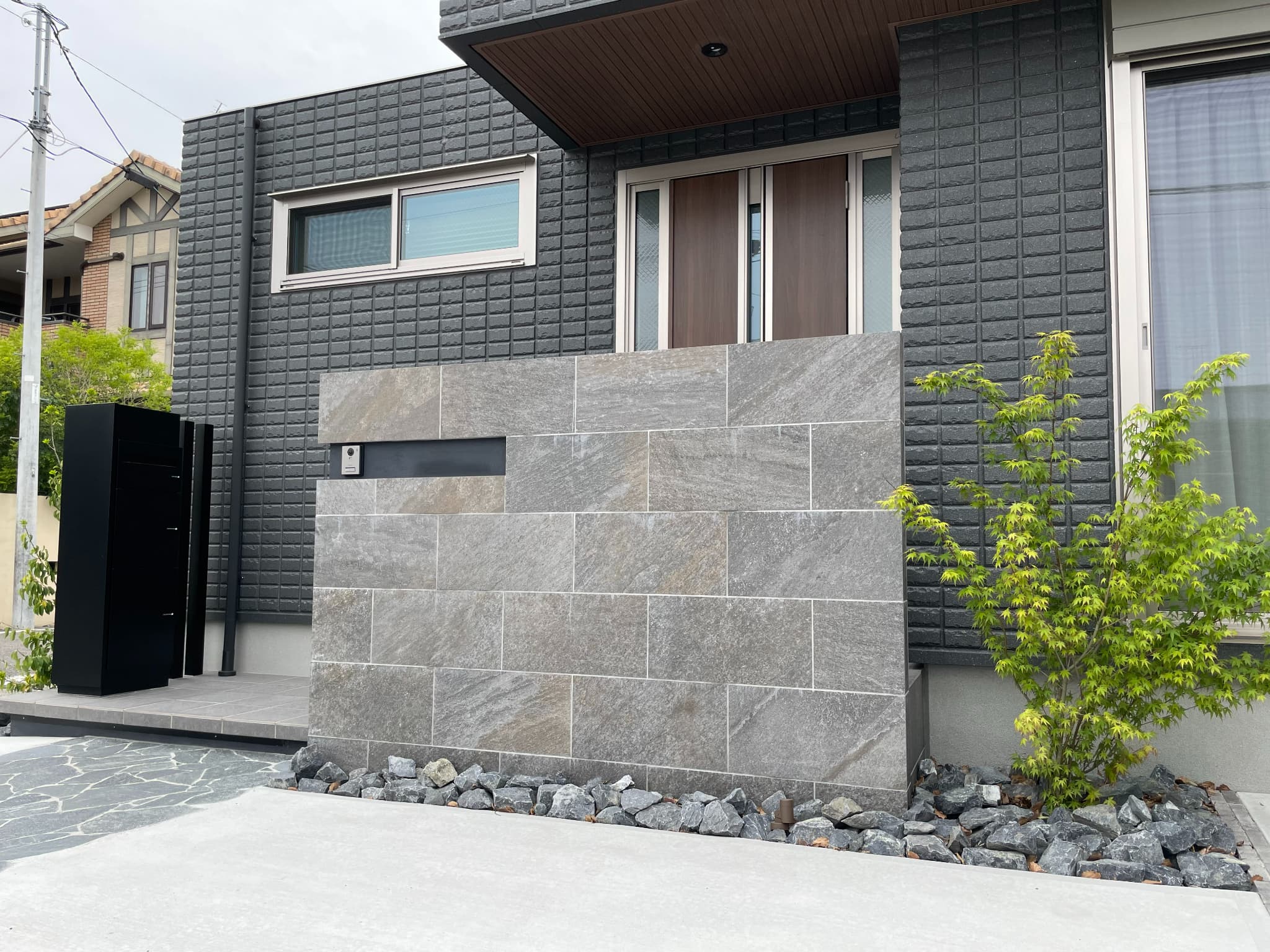 グレーを基調としたシンプルなエクステリアです。玄関前の視線を遮る意匠壁は大判タイルで迫力あるデザインになりました。