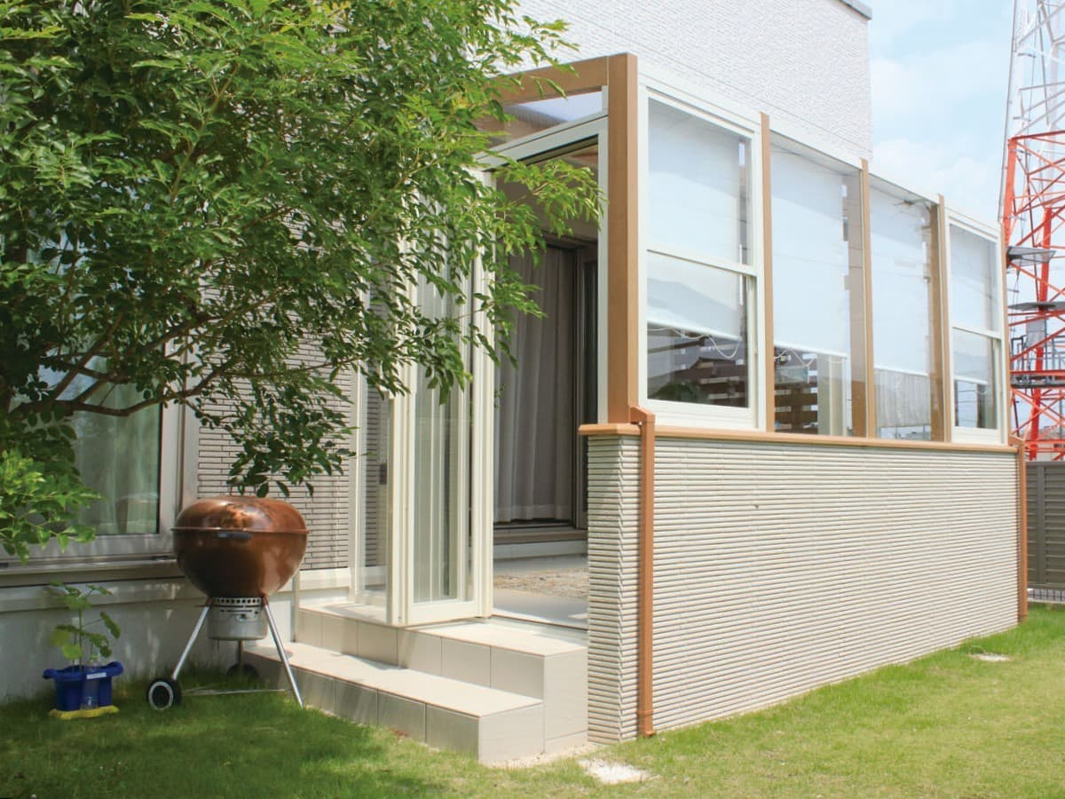 バーべーキューを楽しむ緑に囲まれたお庭。ガーデンルームを設置することでより快適な空間になりました。