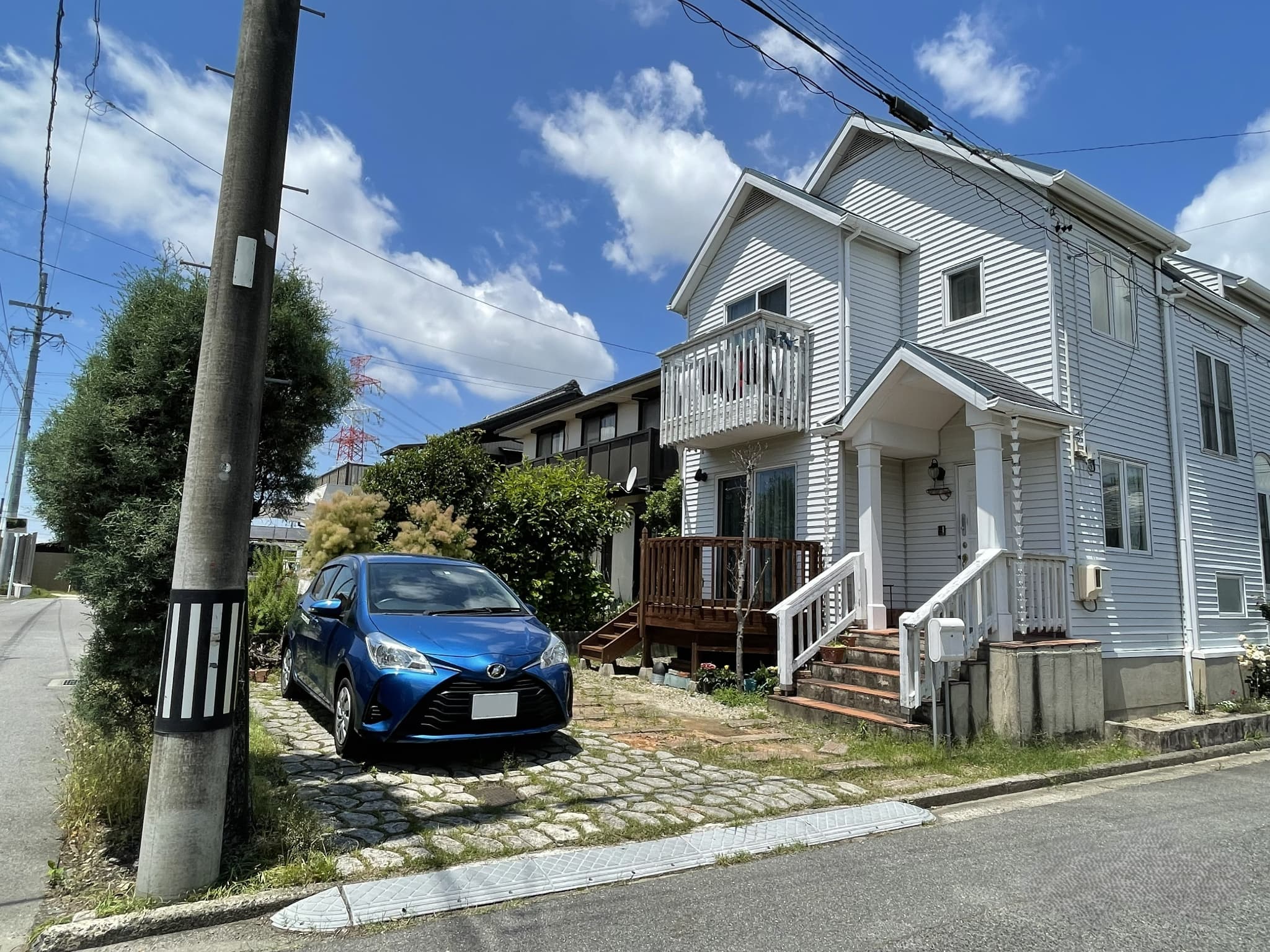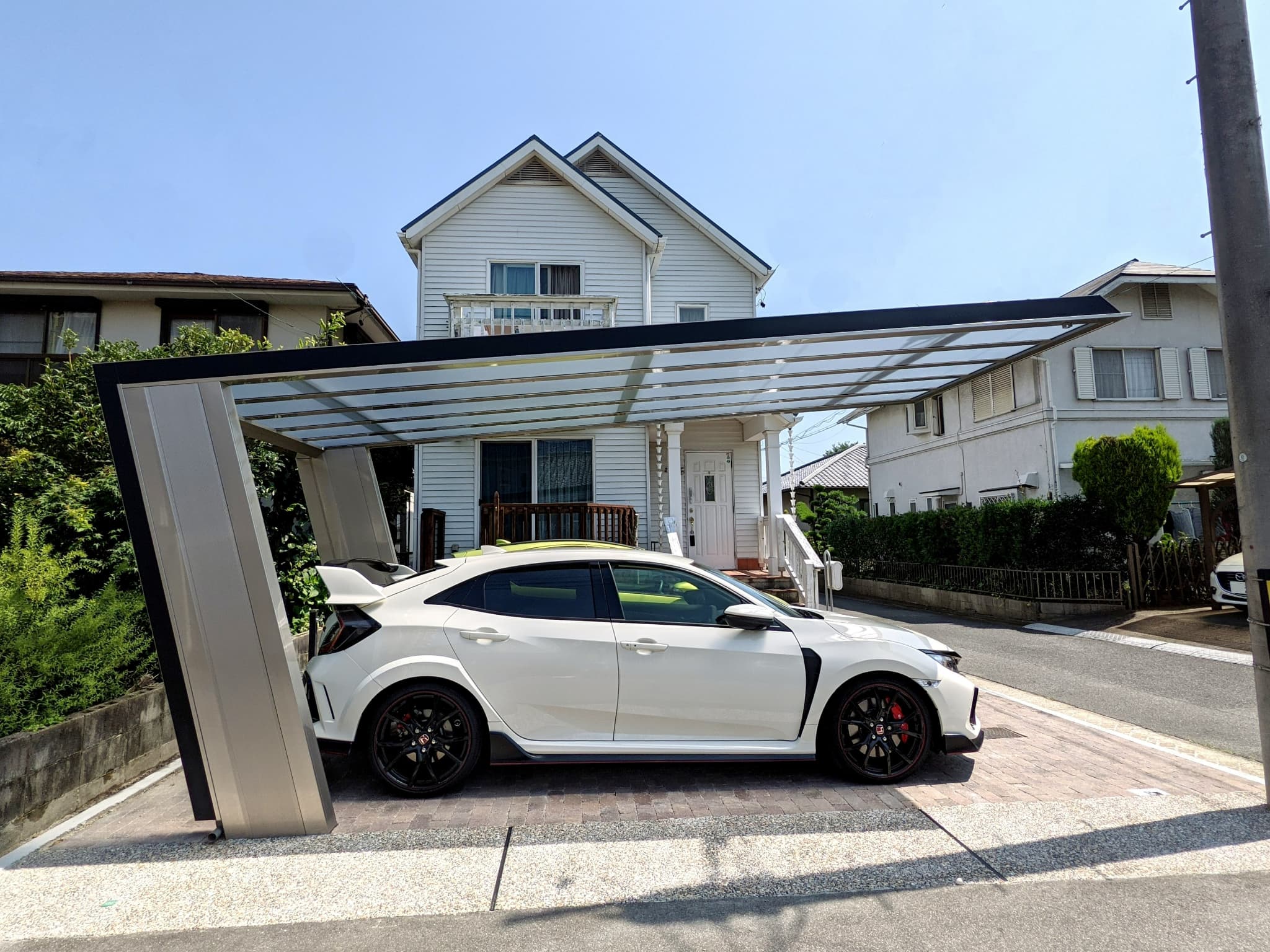 車の出し入れがしやすいように、気になる柱を後方に下げた2本柱のカーポートを施工。レンガ舗装のお洒落な駐車場に仕上げました
