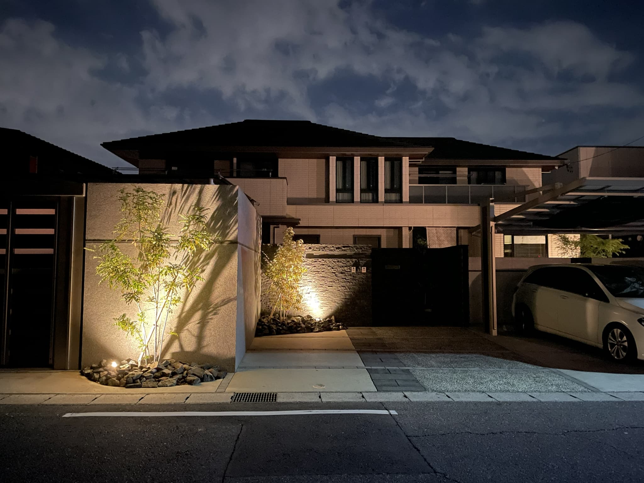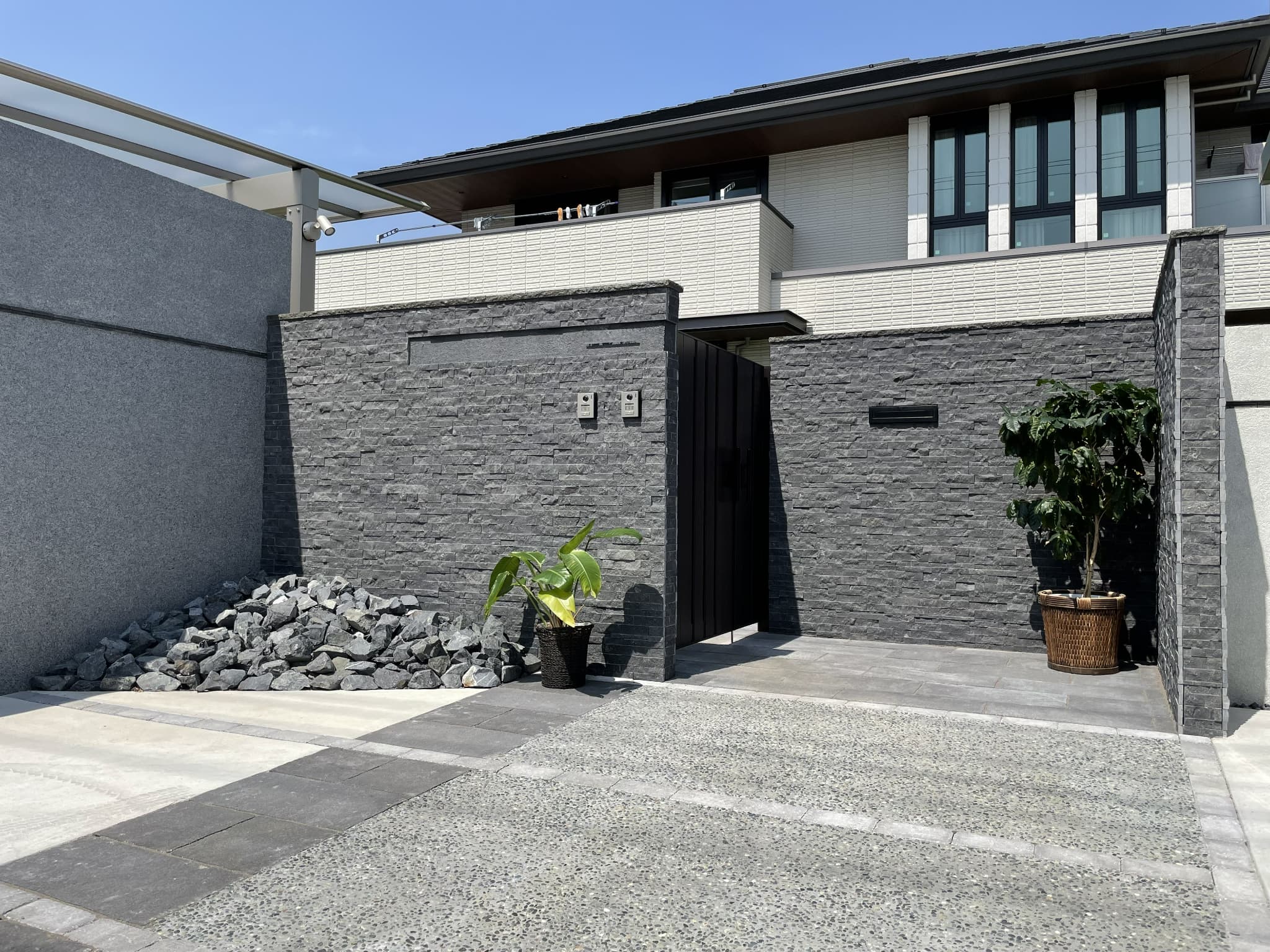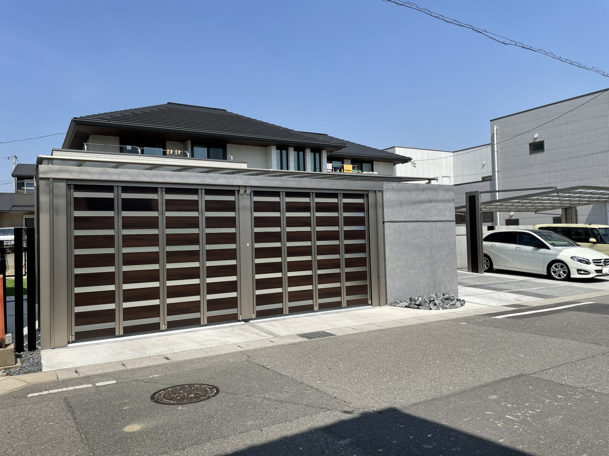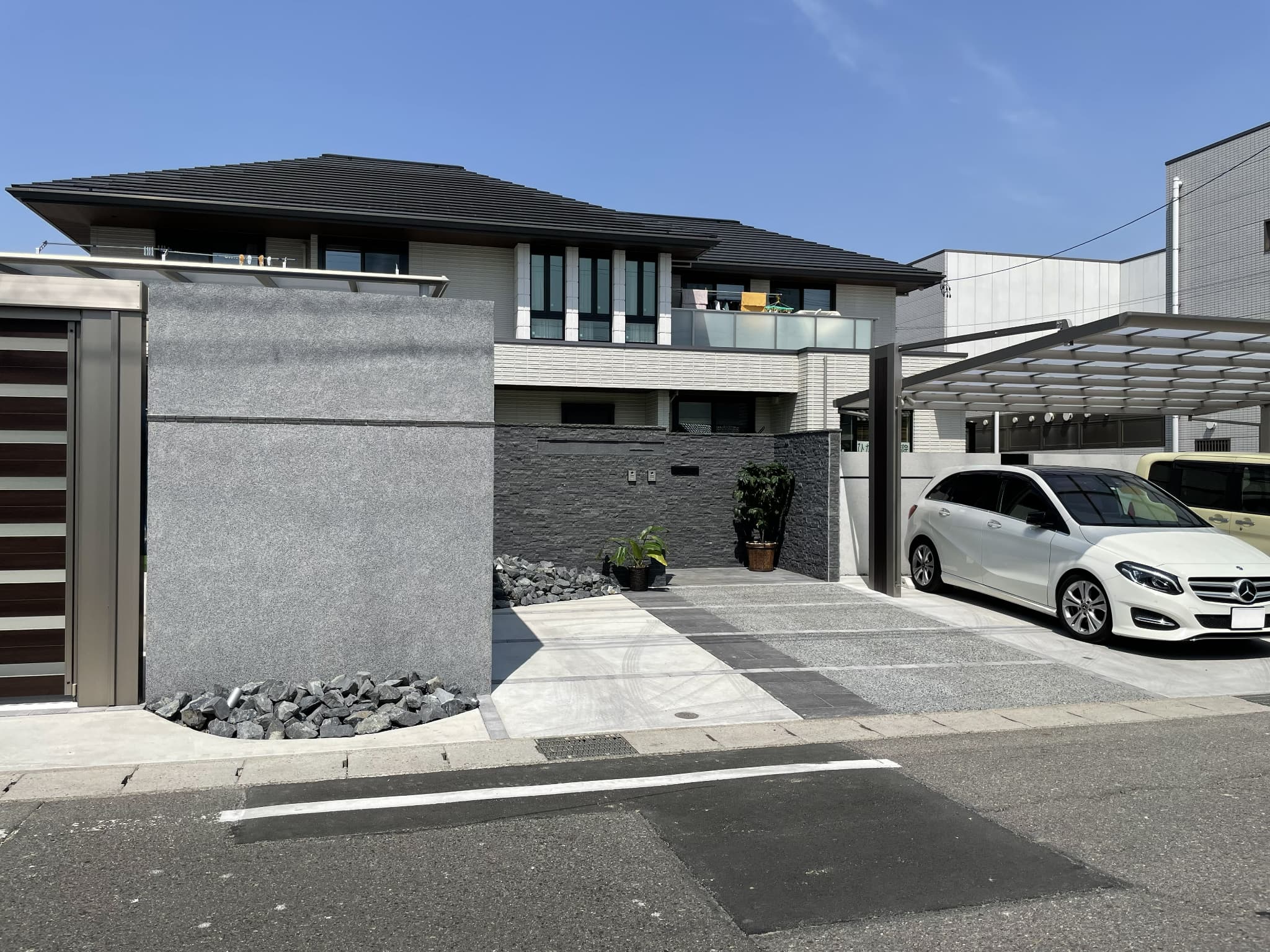 大型ハンガーゲートと水平ラインを揃えたウォールで駐車スペースを囲うオリジナルガレージ。モノトーンで統一したファサードがハイグレードなエクステリアを演出します。